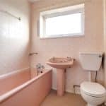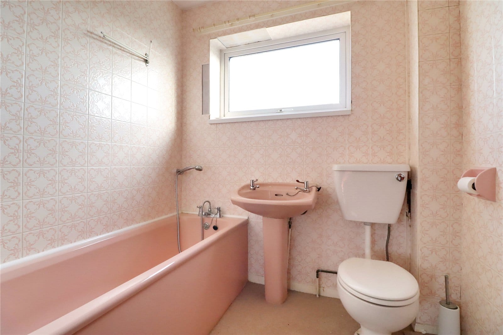 Rear uPVC double glazed window with patterned glazing providing a three piece suite comprising a low flush WC, pedestal wash hand basin, panelled bath and tiled walls.