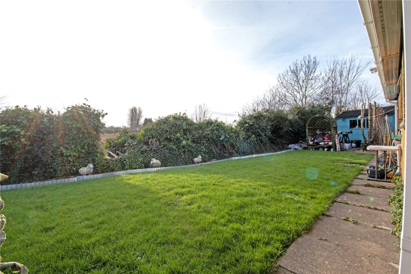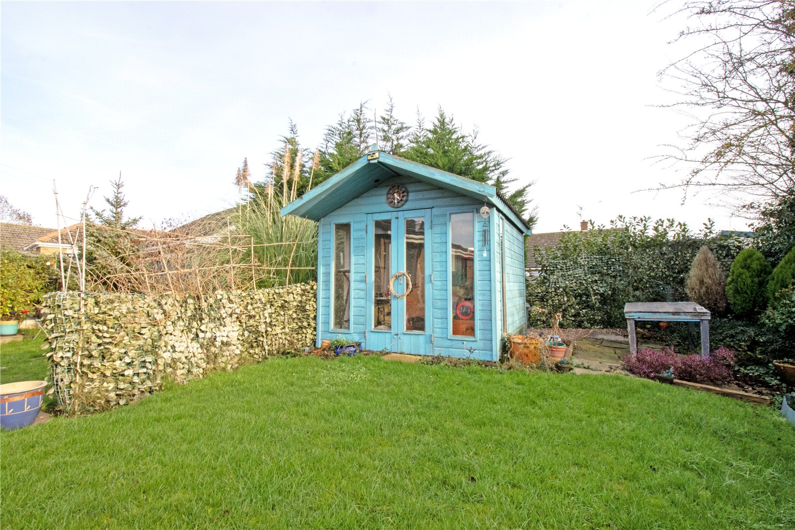 Externally, the property enjoys an attractive lawned frontage, with a driveway providing ample off-road parking and access to the garage, which also benefits from a radiator. To the rear is a particularly impressive south-facing garden, which is fully enclosed and enjoys a high degree of privacy along with open field views. The garden is further enhanced by a summer house and a well-equipped workshop with power, a separate consumer unit, and fitted with a vice and grinder — ideal for hobbies or additional workspace.