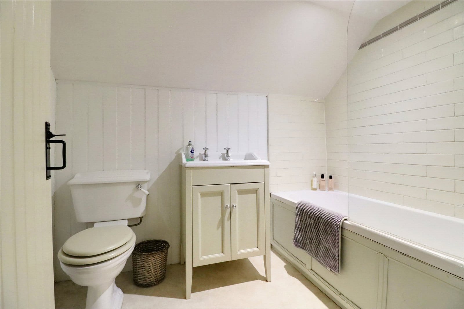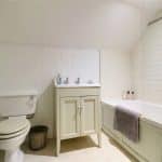 Providing a traditional suite in white comprising low flush WC, heritage vanity wash hand basin with storage cabinet, panelled bath with overhead main shower and glazed screen, cushioned flooring, tiled and panelling to walls and inset ceiling spotlights.