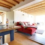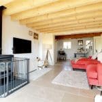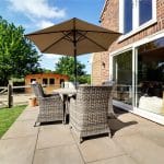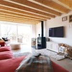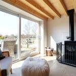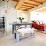 With large rear uPVC double glazed sliding patio doors leading out to the garden and a raised flagged terrace, stone tiled flooring, beamed ceiling and a feature large multi fuel cast iron stove on a slate hearth.
