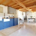 Front uPVC double glazed entrance door and a double glazed Velux roof light within a vaulted ceiling with ceiling spotlights. Featuring a bespoke distressed effect base cabinets with inset ceramic sink with block mixer tap, low flush WC, space and plumbing for appliances, stone tiled flooring, feature exposed brickwork to one wall and part panelling to the remaining walls.