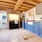 Front facing uPVC double glazed window. The kitchen enjoys a range of base, drawer and wall units of a shaker style being solid wood with a butcher block worktop that incorporates a central Belfast ceramic sink unit with etch drainer to the side and block mixer tap, feature black enemal electric Aga (approx. 1 year old) on a slate stone hearth within a brick chimney breast with inset beamed mantle and downlighting, stone tiled flooring, exposed beams and doors through to the utility and broad opening to;
