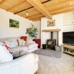 Front facing uPVC double glazed windows, handsome inset multi fuel cast iron stove on a stone flagged hearth, wooden beamed mantel, beamed ceiling, TV point and exposed brickwork to one wall.