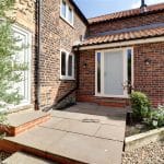With side uPVC double glazed entrance door with adjoining side lights, attractive stone tiled flooring, vaulted ceiling with inset ceiling spotlights, exposed brickwork to one wall and an opening through to;