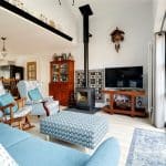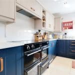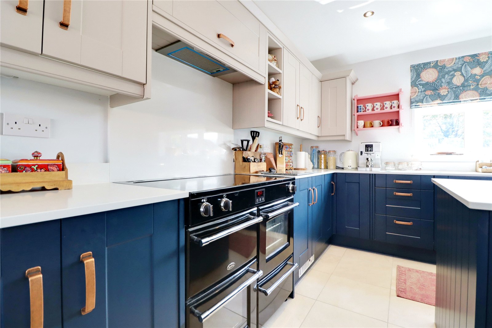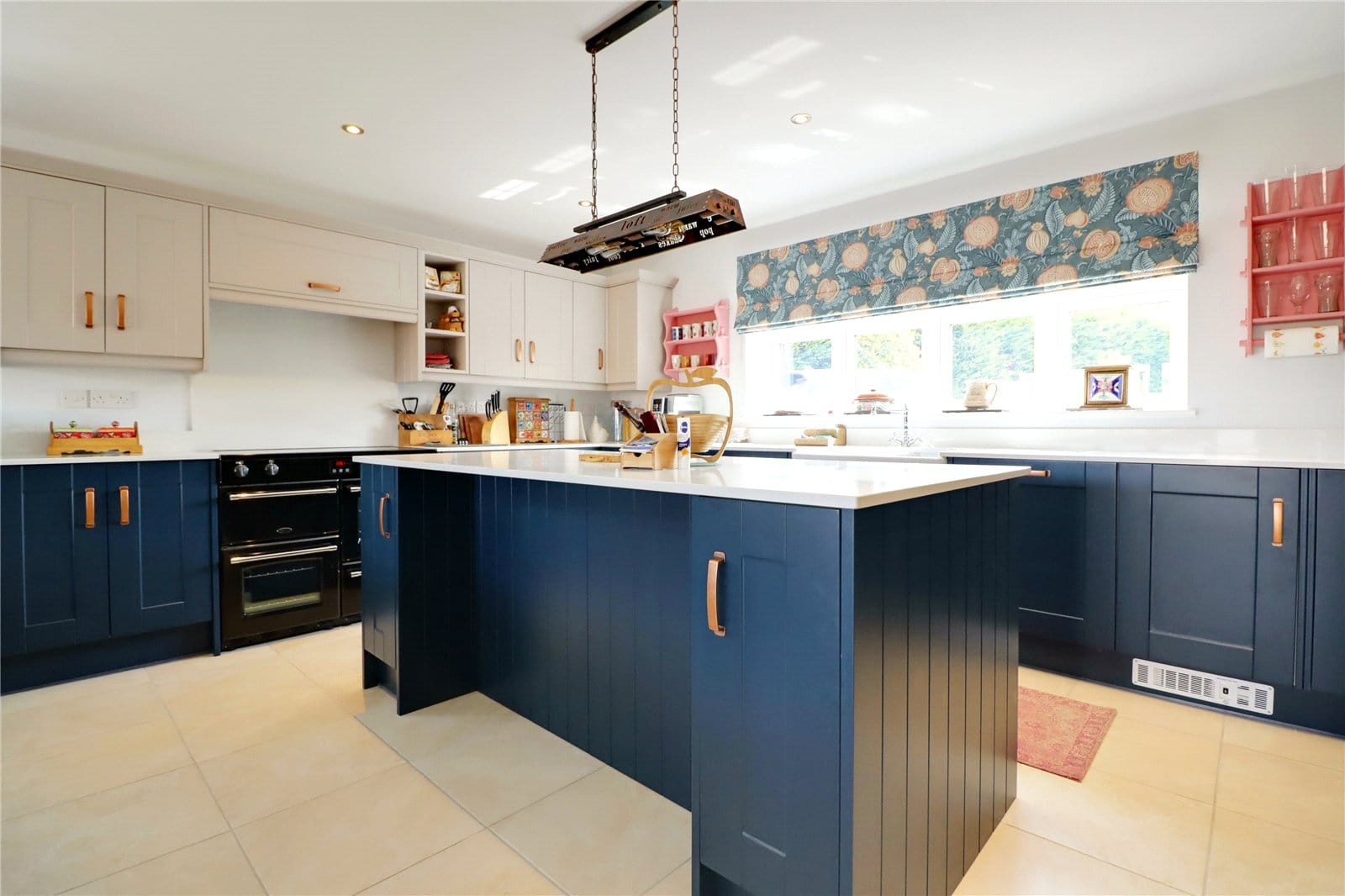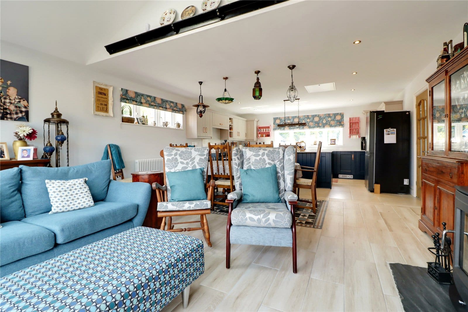 Provides a multi aspect with front and side uPVC double glazed windows and feature rear anthracite grey bi-folding doors that allows access to the garden. The kitchen enjoys range of quality fitted furniture in royal blue and light cashmere with copper style pull handles and enjoying a complementary quartz top with matching uprising that incorporates a double Belfast sink unit with chrome block mixer tap, space for a Range cooker with overhead extractor, central breakfasting island, space for an American style fridge freezer, quality tiled flooring with detailed dining area, feature large multi-fuel cast iron stove with slate hearth and tiled backing, three ceramic radiators and side roof light.