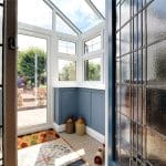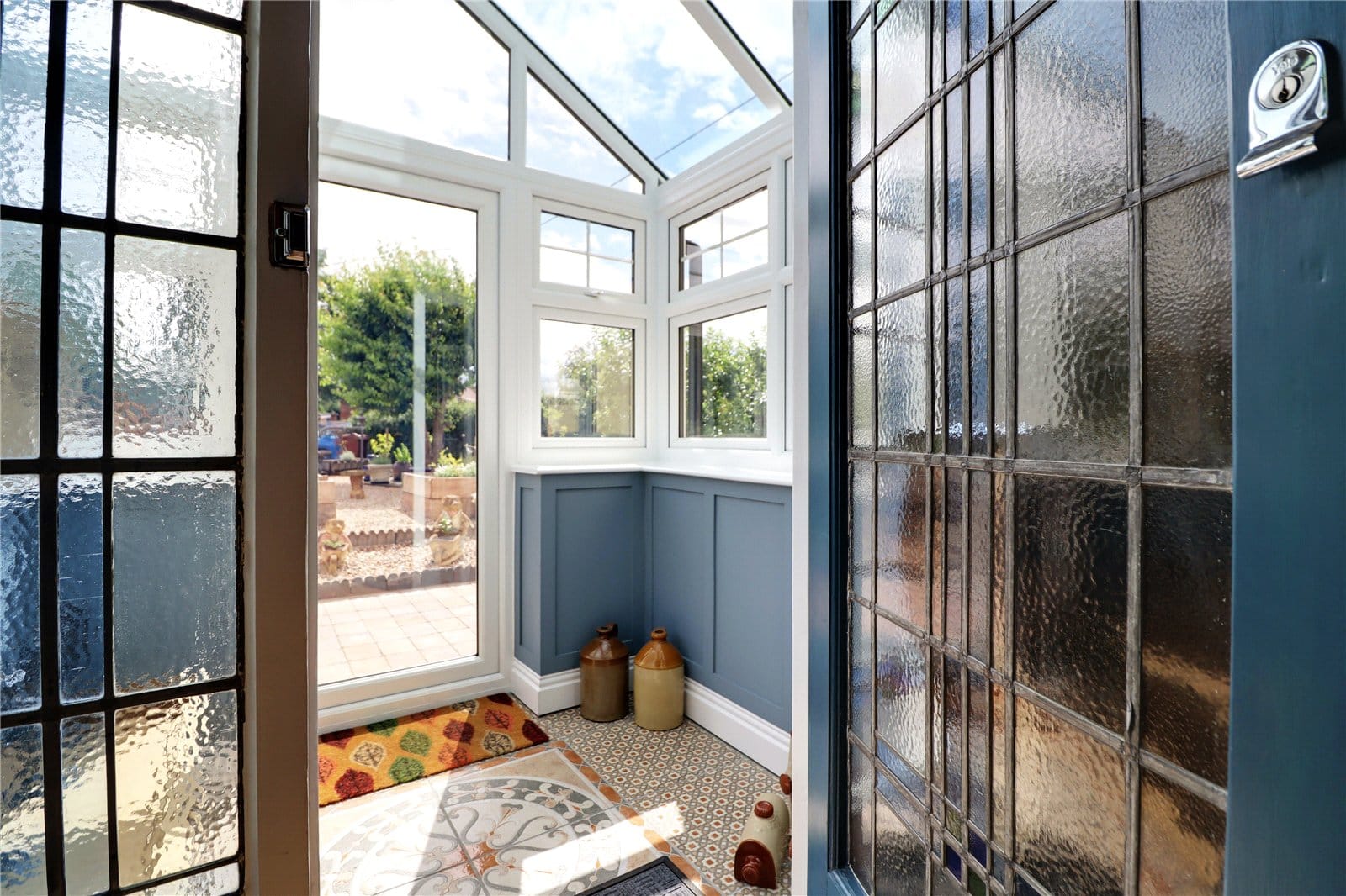 Having dwarf panelled walls with above uPVC double glazed windows, front entrance door, glazed pitched roof, detailed tiled flooring and a handsome original leaded entrance door with adjoining side lights leads through to;