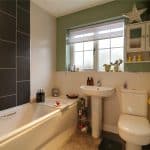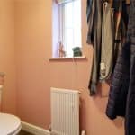 Dimensions: 1m x 2m. Has a front uPVC double glazed window with frosted glazing providing a two piece suite comprising a low flush WC and a pedestal wash hand basin with tiled splash back, continuation of vinyl flooring, wall to ceiling coving and extractor fan.