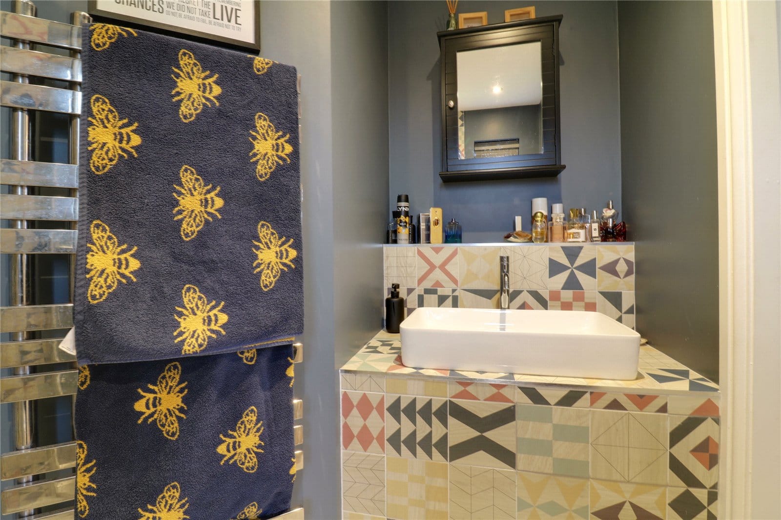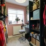 Dimensions: 1.5m x 1.65m. With a side uPVC double glazed window with frosted glazing and a three piece suite comprising of a corner walk-in shower cubicle with overhead chrome mains shower with attractive mermaid boarding splash backs and sliding curved glazed door, a low flush WC and a rectangular vanity wash hand basin with further attractive mermaid boarding splash back. vinyl flooring, a wall mounted chrome towel heater, ceiling spotlights and extractor fan