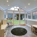 Dimensions: 2.6m x 2.9m. With a fully insulated pitched roof with inset ceiling spotlights, bi-folding doors allowing access to the garden with further side uPVC double glazed windows and attractive oak style vinyl flooring.