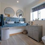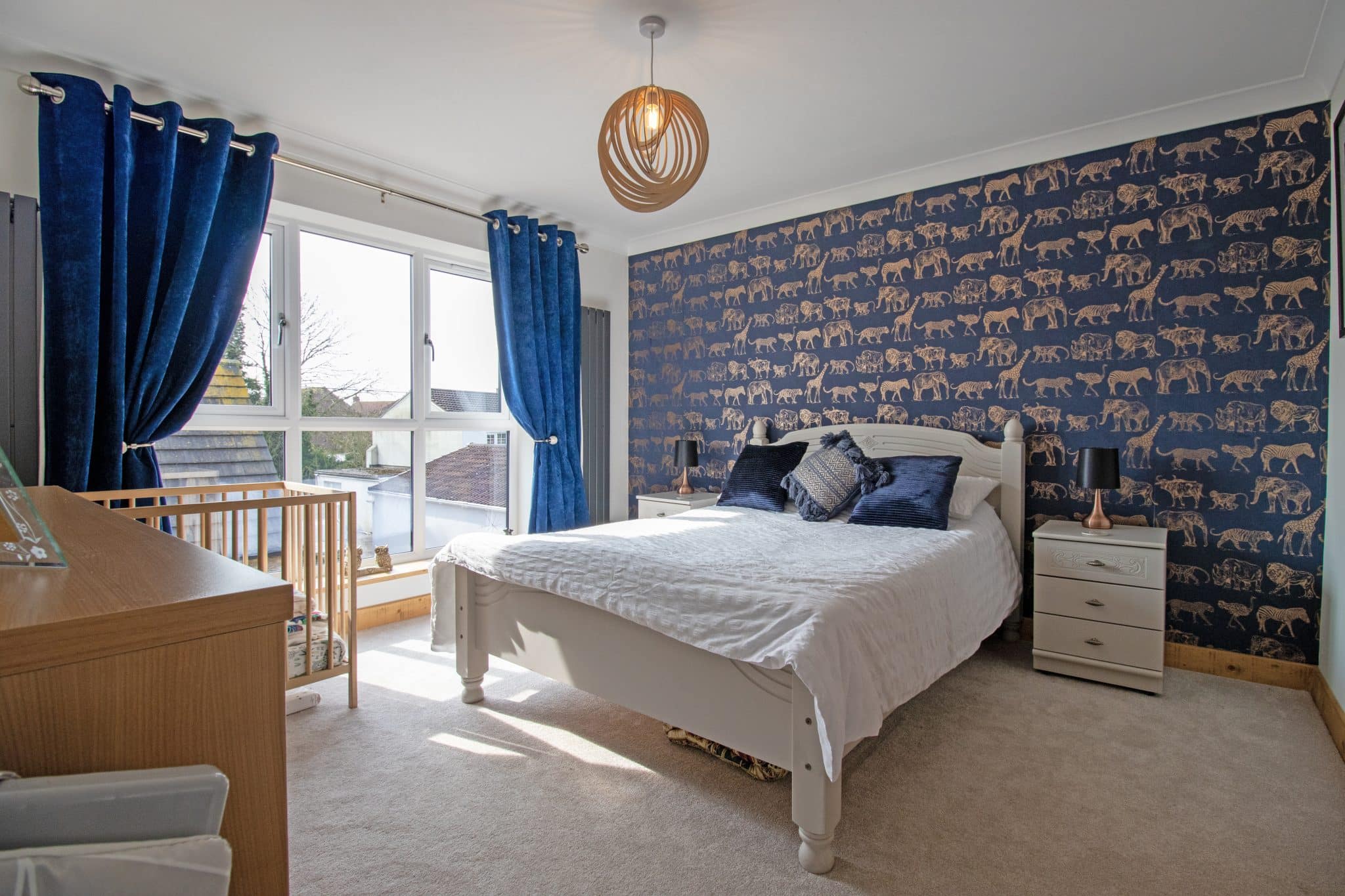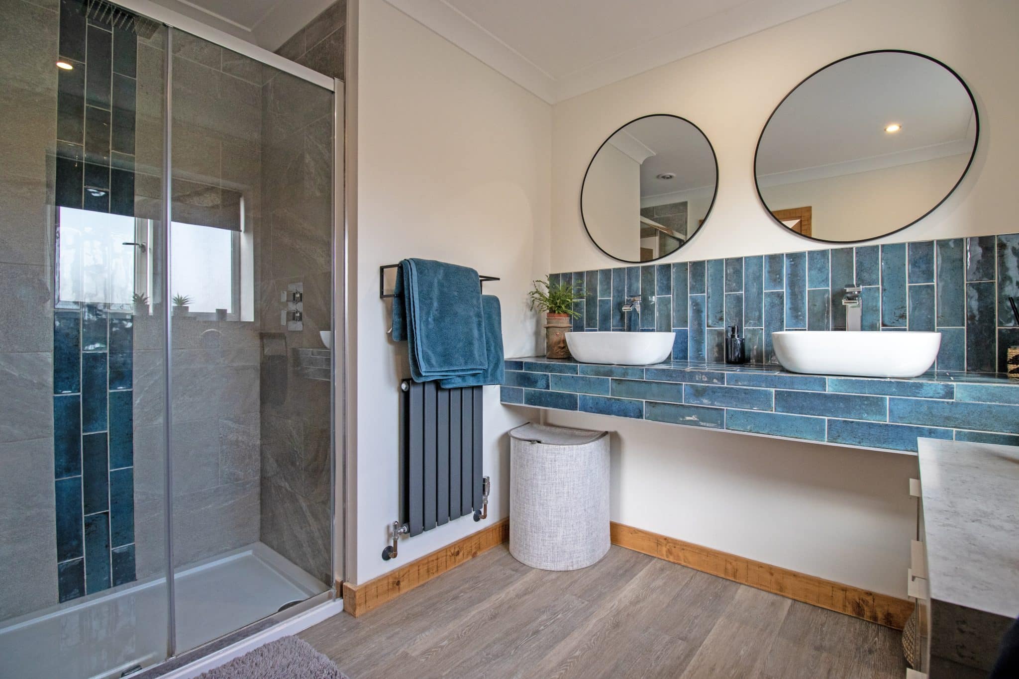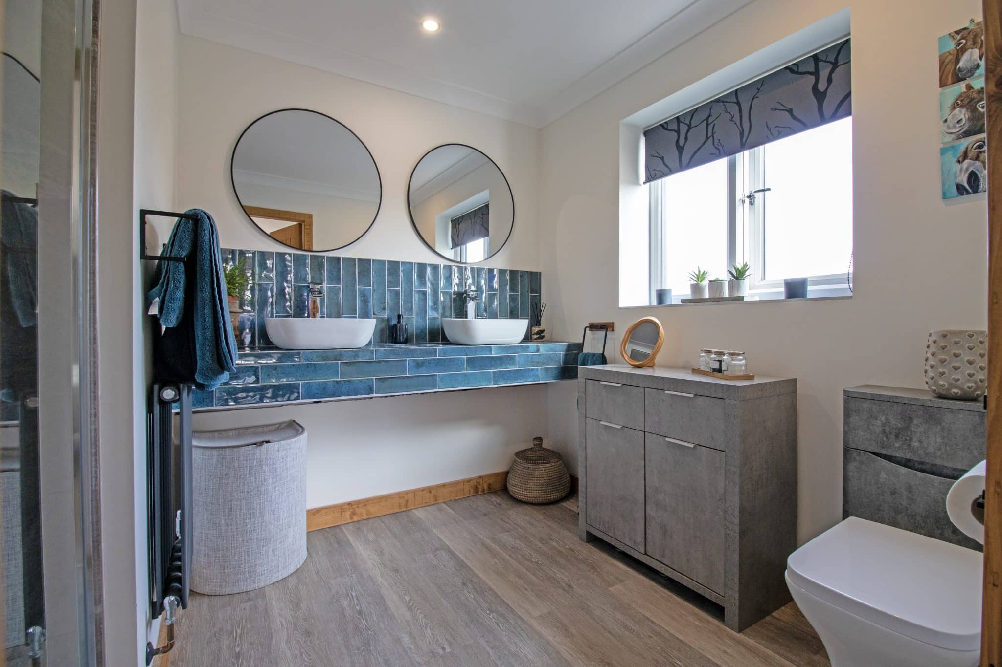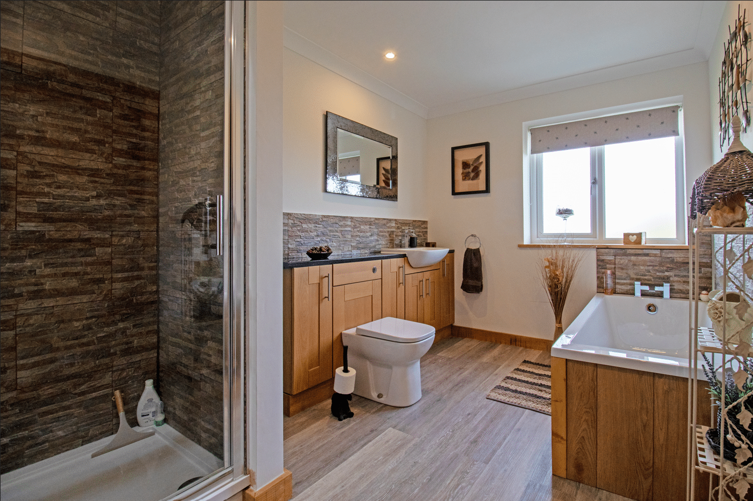 To the first floor, a spacious landing leads to four generously sized double bedrooms, all beautifully presented. The principal suite is particularly impressive, offering a stylish feature wall, an abundance of natural light, and a dedicated walk-in wardrobe with extensive storage. Both the principal bedroom and bedroom two benefit from well-appointed en-suite shower rooms, while bedroom three enjoys Jack and Jill access to the luxurious family bathroom. The main bathroom itself is finished to an exceptional standard, featuring a four-piece suite including a walk-in shower, double basin vanity unit, contemporary fittings, and a heated towel rail.