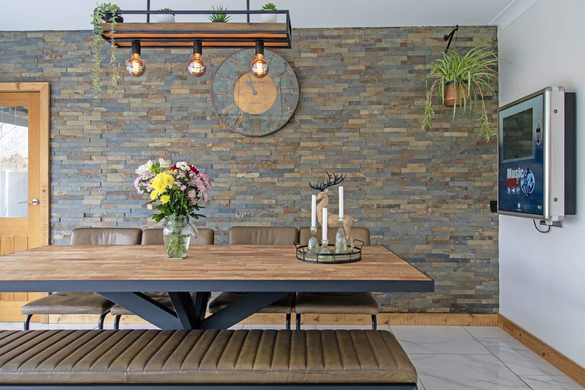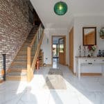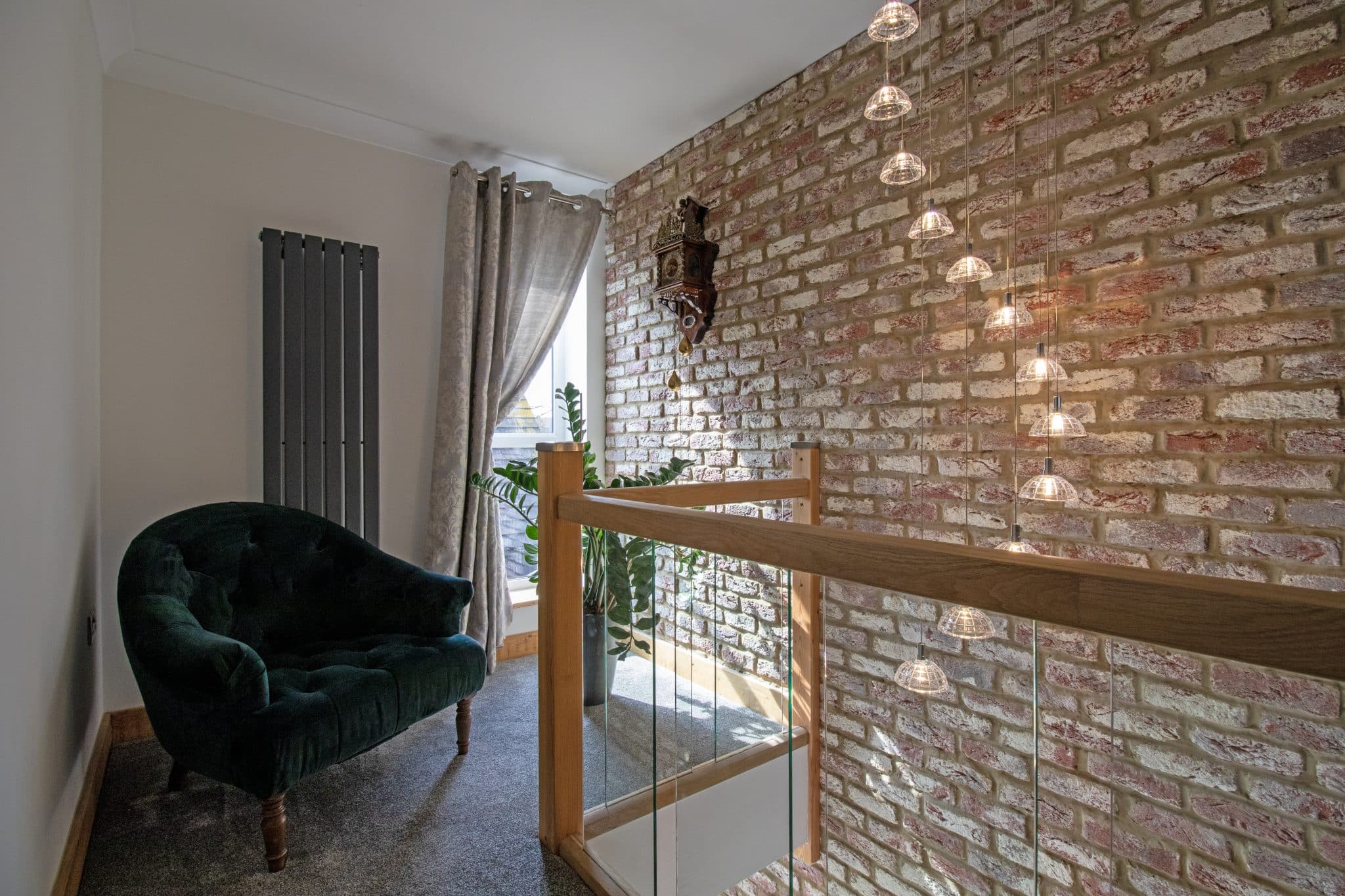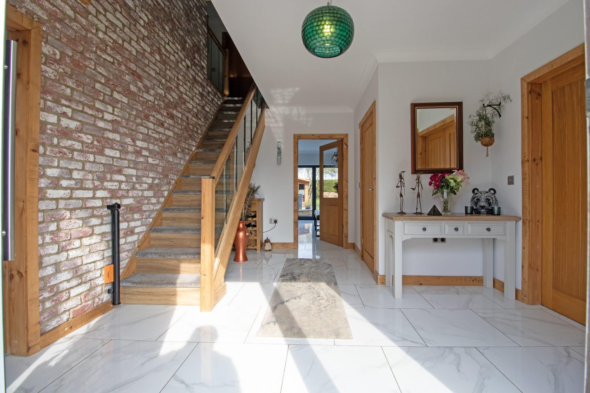 Set behind a secure, gated entrance, the property immediately impresses with a substantial frontage and a generous driveway providing ample off-road parking for multiple vehicles, along with access to a detached double garage. The approach creates a real sense of arrival, which continues as you step into the striking entrance hall. Here, a beautiful exposed brick feature wall, marble tiled flooring, and a contemporary glass-panelled staircase combine to create a bright, stylish, and welcoming space filled with natural light.