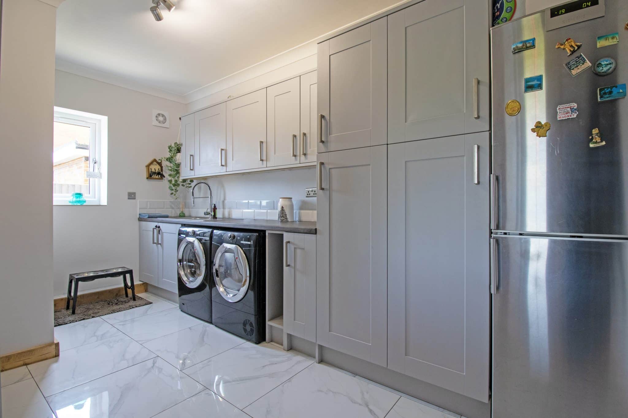 At the heart of the home lies a stunning open-plan kitchen and dining area, designed with both style and functionality in mind. Featuring sleek, high-quality units, premium integrated appliances, and a central island with breakfast bar seating, this space is perfect for everyday living and entertaining alike. Large bi-folding doors open seamlessly onto the rear garden, creating a wonderful indoor-outdoor flow. A fitted utility room and ground floor WC complete the accommodation on this level.