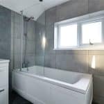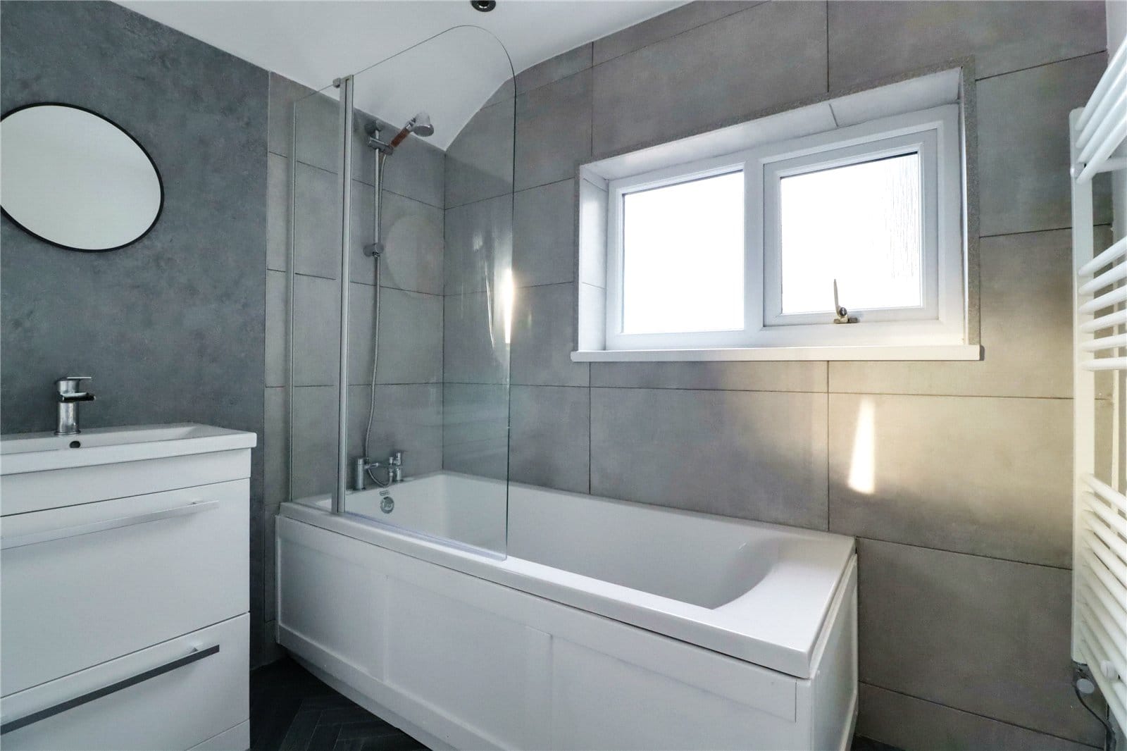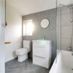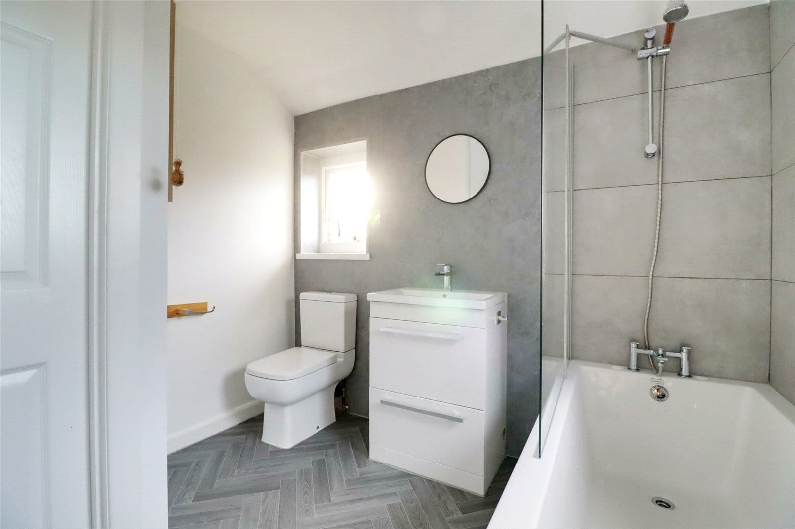 Rear and side uPVC double glazed windows with patterned glazing providing a modern suite in white comprising a low flush WC, vanity wash hand basin with drawer units beneath, panelled bath with shower attachment and glazed screen, herringbone style cushioned flooring, mermaid boarding and tiling to two walls and inset ceiling spotlights.