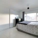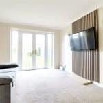 Large front wood grain effect uPVC double glazed window, TV point and wall to ceiling coving.