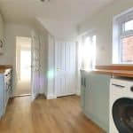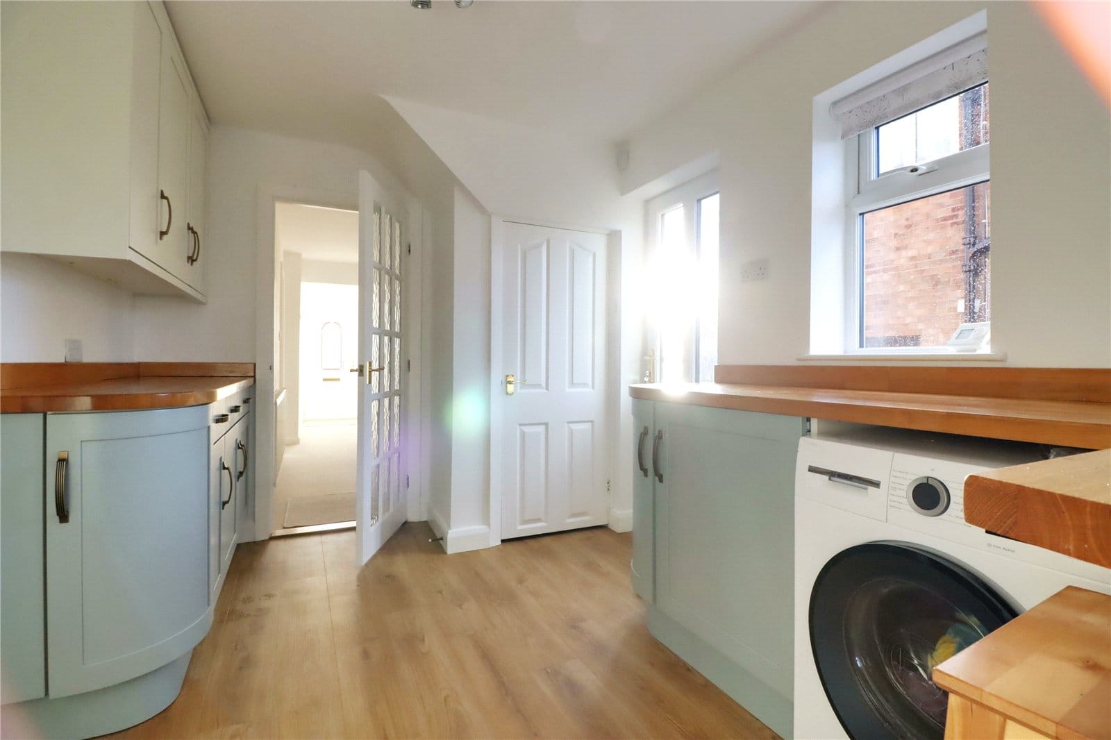 With surrounding uPVC double glazed windows and matching side entrance door with patterned glazing. The kitchen enjoys an extensive range of shaker style two tone furniture with a butcher block worktop with matching uprising that continues to create a breakfast bar that incorporates a one and a half bowl sink unit with drainer to the side and block mixer tap, built-in four ring gas hob with overhead extractor and double oven beneath, space and plumbing and attractive laminate flooring.