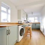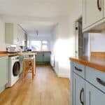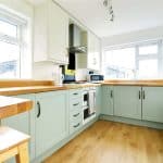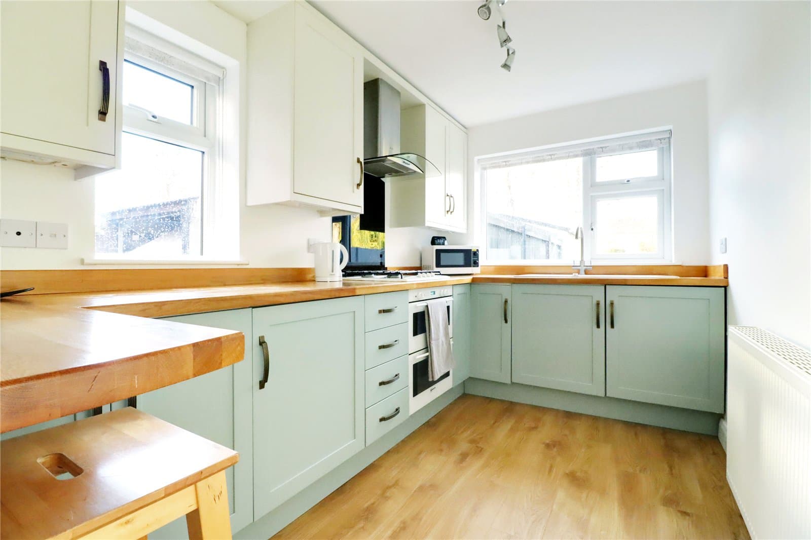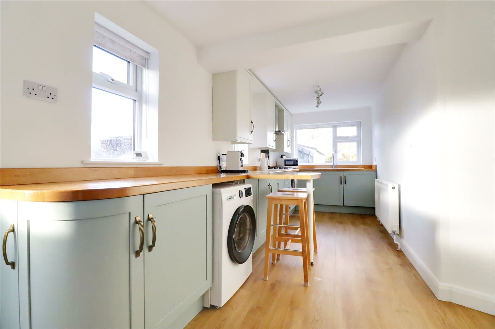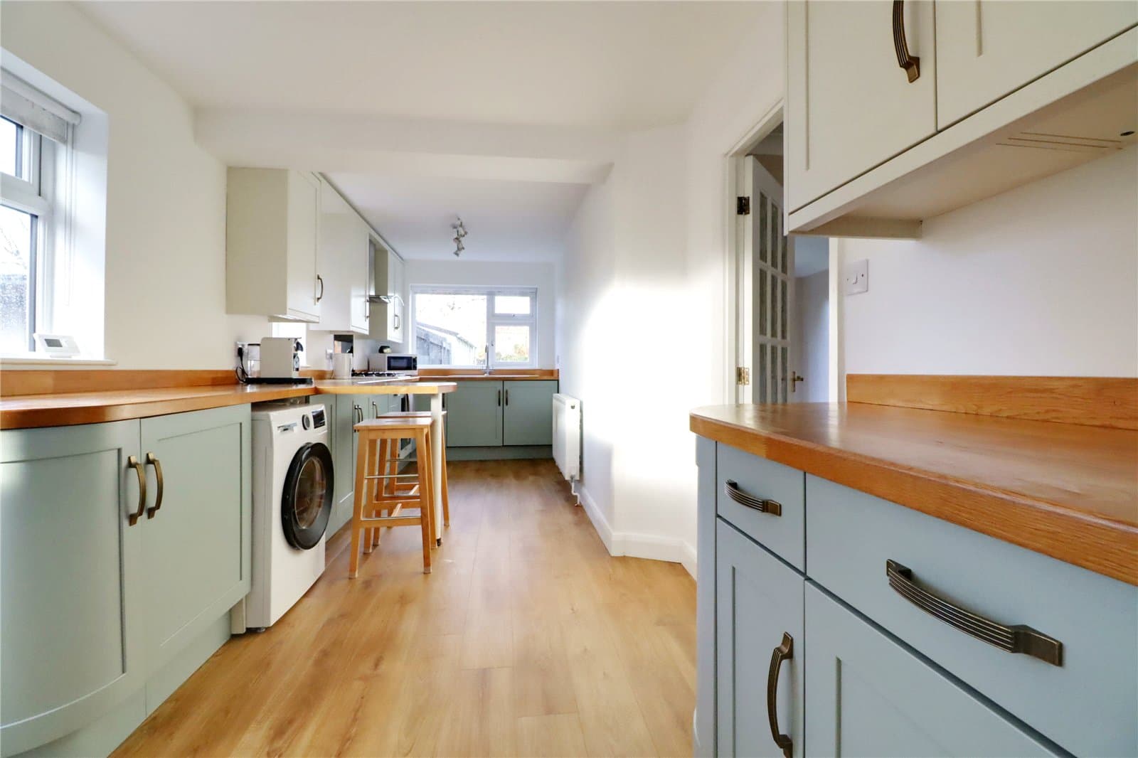 With surrounding uPVC double glazed windows and matching side entrance door with patterned glazing. The kitchen enjoys an extensive range of shaker style two tone furniture with a butcher block worktop with matching uprising that continues to create a breakfast bar that incorporates a one and a half bowl sink unit with drainer to the side and block mixer tap, built-in four ring gas hob with overhead extractor and double oven beneath, space and plumbing and attractive laminate flooring.