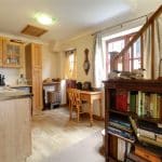 With a multi aspect including front and side uPVC double glazed windows, wall to ceiling coving and TV input. The kitchen enjoys a patterned working top surface with oak style low level units, drawer units and wall units with glazed fronts and a one and a half ceramic sink bowl unit with block mixer tap and drainer to the side with tiled splash backs, space for an undercounter fridge, oak style vinyl flooring, further side barn style hardwood double glazed door allowing access to the driveway, loft access and a log legged staircase leads to the first floor off the annex.