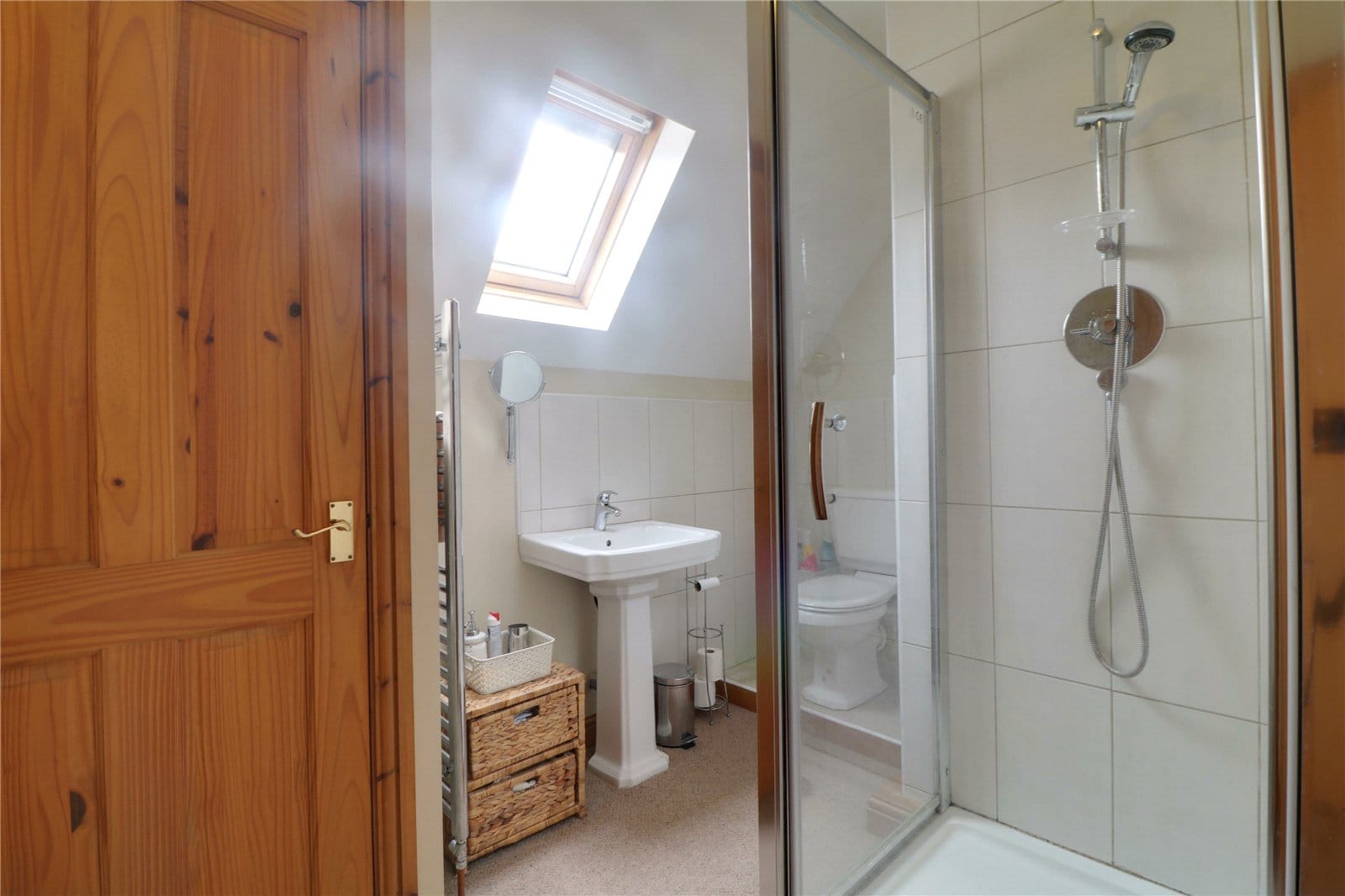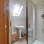 With a Velux skylight, a three piece suite comprising a single walk-in shower cubicle with overhead chrome mains shower, tiled splash backs, a low flush WC and a pedestal wash hand basin with further partly tiled walls, wall mounted chrome towel heater, extractor fan and a built-in storage cupboard.