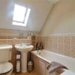 With a rear Velux skylight providing a three piece suite in white comprising a panelled bath, a low flush WC and a pedestal wash hand basin with partly tiled walls, laminate flooring and extractor fan.