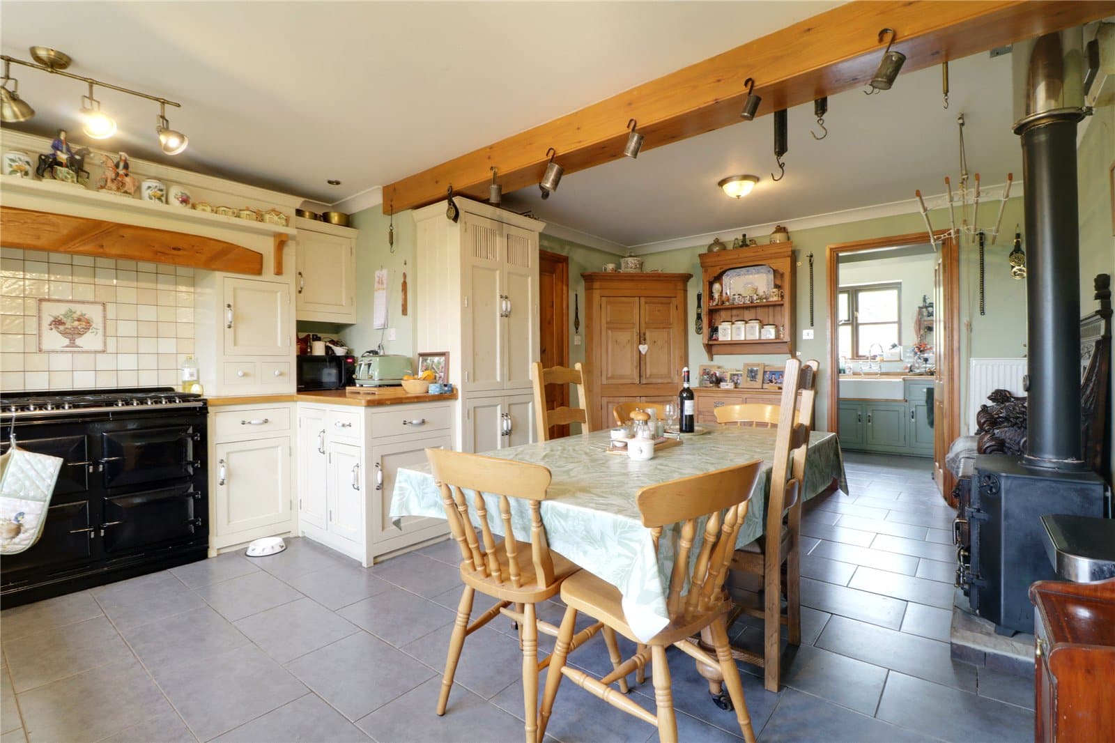 With a front hardwood double glazed. The kitchen includes a range of country style shaker low level units, drawer units and wall units with decorative pull handles with solid wood working top surfaces incorporating a twin inset Belfast sink unit with block mixer tap and drainer to the side, space for a free standing Range Master Aga cooker with overhead integrated extractor fan with splash back, space for a tall fridge freezer, tiled flooring, wall to ceiling coving, a floor standing multi burning stove feature with tiled splash back and a further internal door allows access off to;