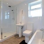 Enjoys a rear obscured uPVC double glazed window, providing a four piece suite comprising a panelled bath with shower head attachment, wash hand basin, low flush WC and double walk-in shower enclosure with waterfall shower head and seperate shower attachement, vertical chrome heated towel rail.