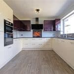 Has two front uPVC double glazed windows and a secure composite door with glass inserts. The kitchen enjoys high gloss cream wall, base and drawer units with a complementary quartz countertops, integral appliances including fridge freezer, dishwasher, oven and four ring gas hob with extractor hood above, combination microwave, sunken sink unit and drainer with attractive wood effect flooring and double internal doors allows access to;