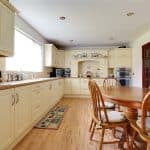 With a rear uPVC double glazed window. The kitchen enjoys an extensive range cream shaker style low level units drawer units and wall units with brushed aluminium style pull handles, a laminate working top surface incorporating a single cermaic stainless steel sink bowl unit with drainer to the side, built-in electric oven with matching grill, four ring induction hob with overhead integral extractor, TV input, integral fridge and oak style vinyl flooring.