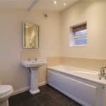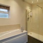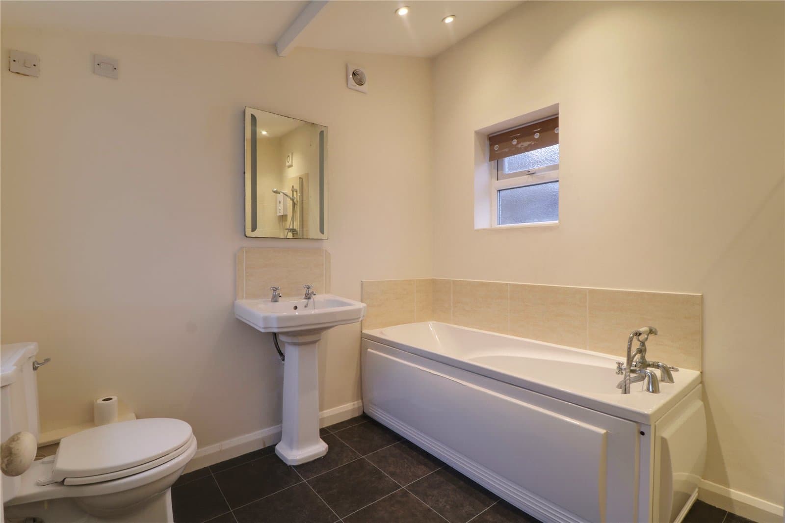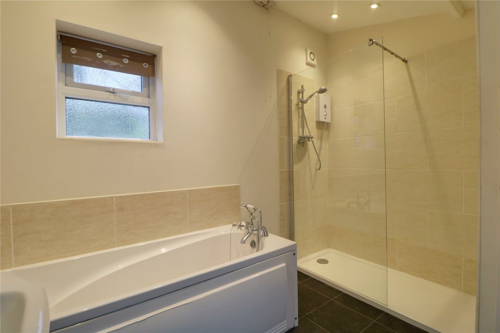 With a front hardwood frosted glazing window and a rear uPVC double glazed window with frosted glazing, providing a four piece suite in white comprising a double walk-in shower cubicle with overhead electric Bristan shower with glazed screen and tiled splash backs, panelled bath with tiled splash back, wash hand basin and a low flush WC, vinyl flooring, extractor fan and ceiling spotlights.