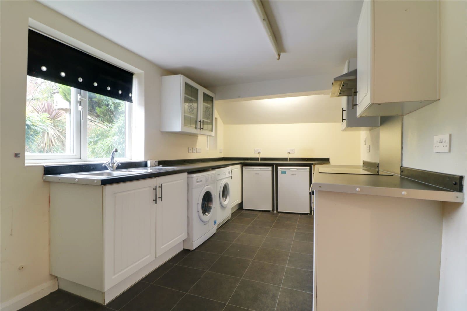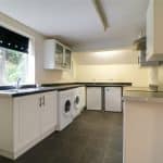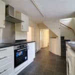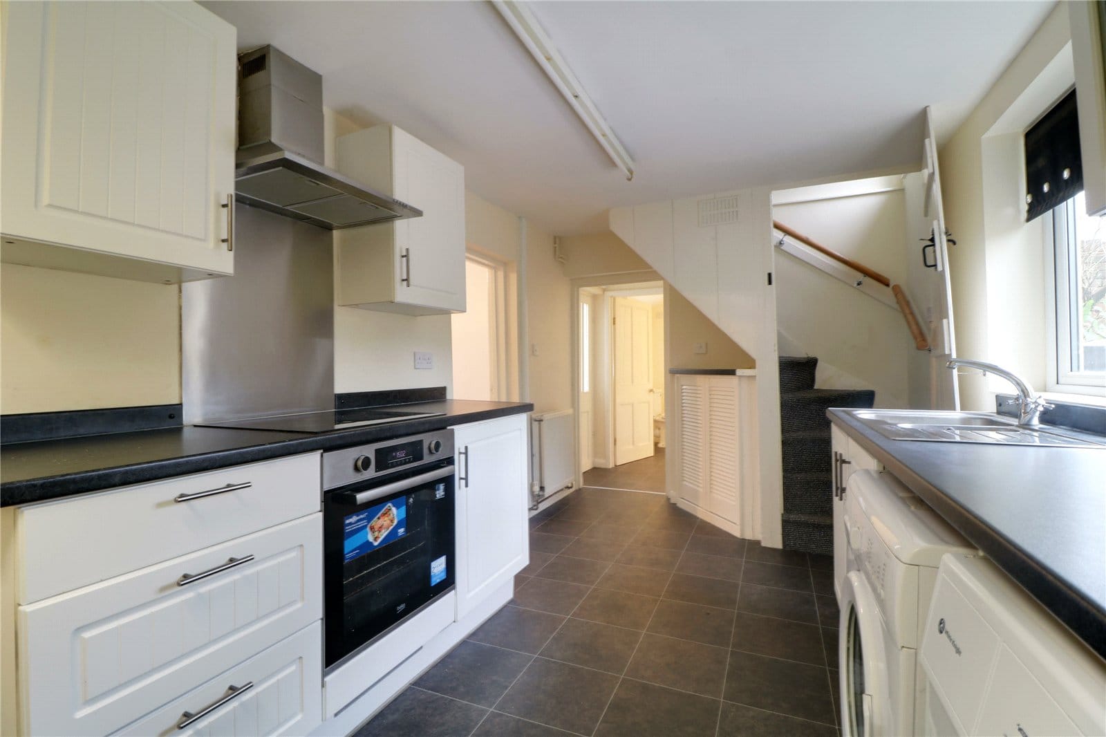 With two rear uPVC double glazed windows. The kitchen provides a range of white low level units, drawer units and wall units with glazed fronts and brushed aluminium style pull handles with a patterned working top surface incorporating a one and a half stainless steel sink unit with block mixer tap and drainer to the side, uprising to the working top, a Beko integral oven with matching four ring hob with overhead stainless steel canopied extractor fan with downlighting, stainless steel splash back, plumbing for a washing machine, space for an undercounter tumble dryer, further space for an undercounter fridge and freezer, vinyl flooring, a dog legged staircase leads to the first floor accommodation with adjoining grabrail and further internal doors leads off to;