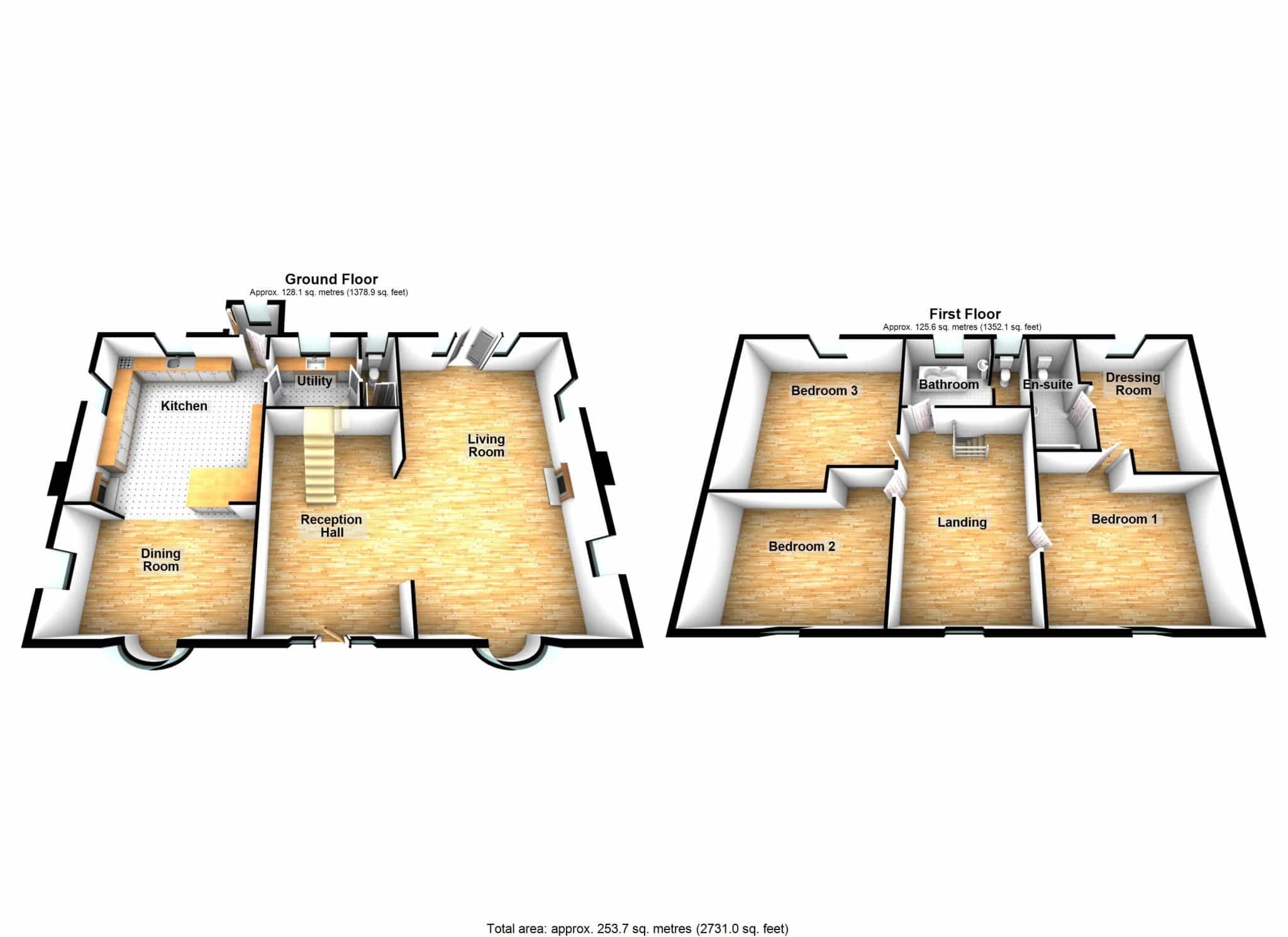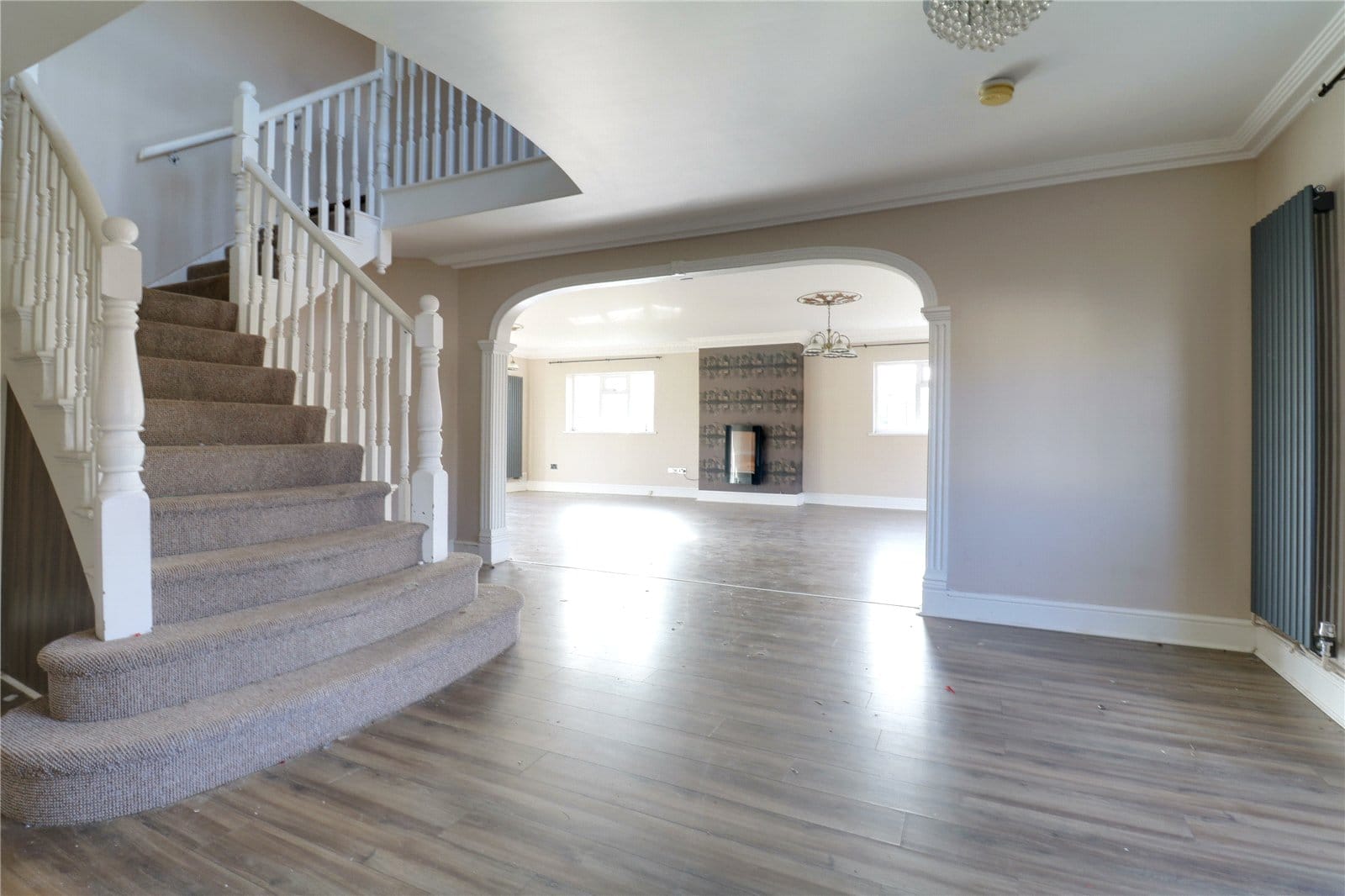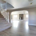 Dimensions: 3.89m x 6.22m. With central front uPVC double glazed and leaded entrance door with adjoining side lights, laminate flooring, a feature return staircase leads to the first floor accommodation with open spell balustrading and twin large newel posts, two modern radiators, wall to ceiling coving and a broad opening leads to;