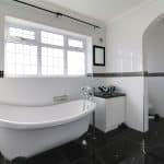 Two rear uPVC double glazed windows with patterned glazing providing a three piece suite comprising a close couple low flush WC, circular wash hand basin, rolled top free standing bath, ceramic tiled flooring, and fully tiled walls, fitted towel rail and built-in white fronted storage cabinets.