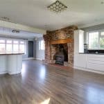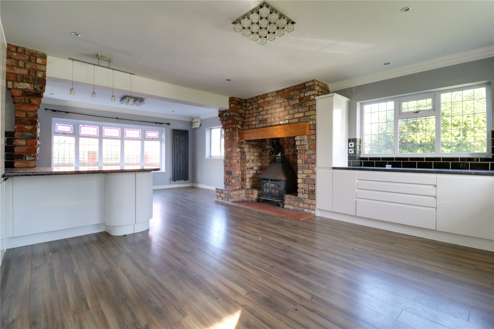 Dimensions: 5.13m x 5.36m. With side and rear uPVC double glazed and leaded windows providing an extensive range of contemporary handleless gloss white furniture with a contemporary contrasting patterned top with tiled splash backs, incorporating a one and a half bowl ceramic sink unit with drainer to the side and block mixer tap, built-in gas hob with overhead ceiling suspending extractor, large brick fireplace with inset multi-fuel cast iron stove with quarry tiled hearth and wooden beamed mantel, an internal uPVC entrance door leads to the rear porch, modern radiator and broad access leads through to;
