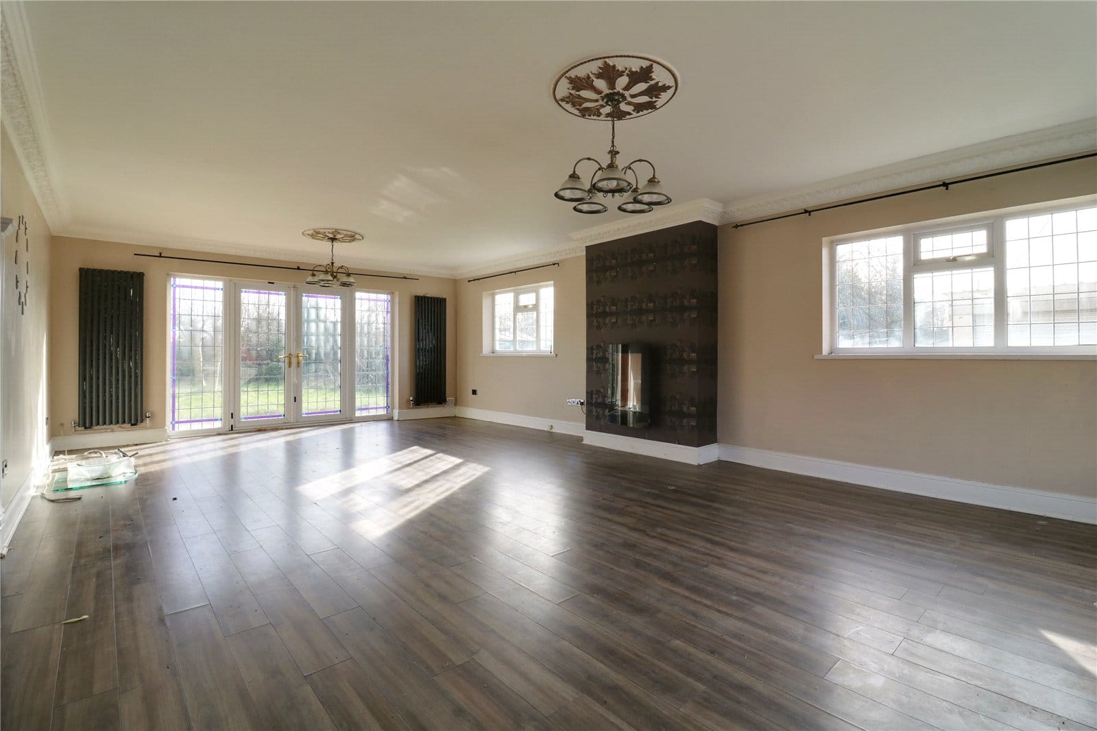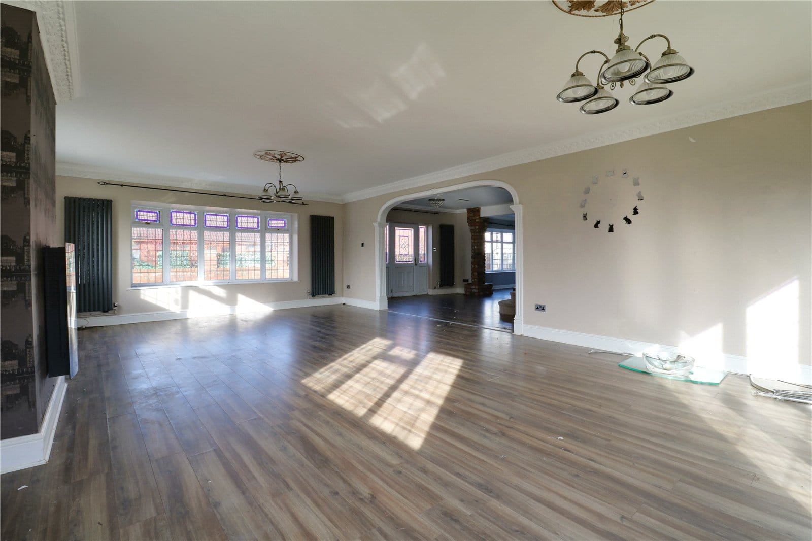 Dimensions: 5.13m x 8.8m. Benefitting from surrounding uPVC double glazed and leaded windows, matching rear French doors leads to the garden with adjoining side lights, four modern style radiators, an electric fire, detailed wall to ceiling coving and twin ceiling roses.
