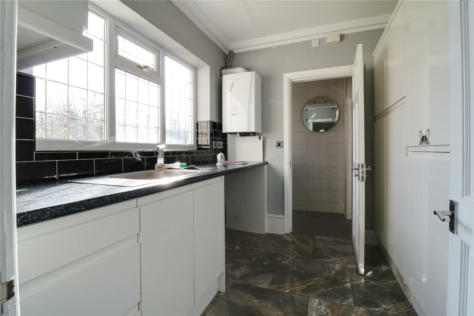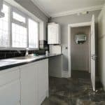 Dimensions: 2.7m x 2.4m. With rear uPVC double glazed and leaded window, matching furniture to the kitchen, patterned worktop incorporating a stainless steel sink unit, plumbing and space for appliances, wall mounted gas central heating boiler, ceramic tiled flooring and doors to;