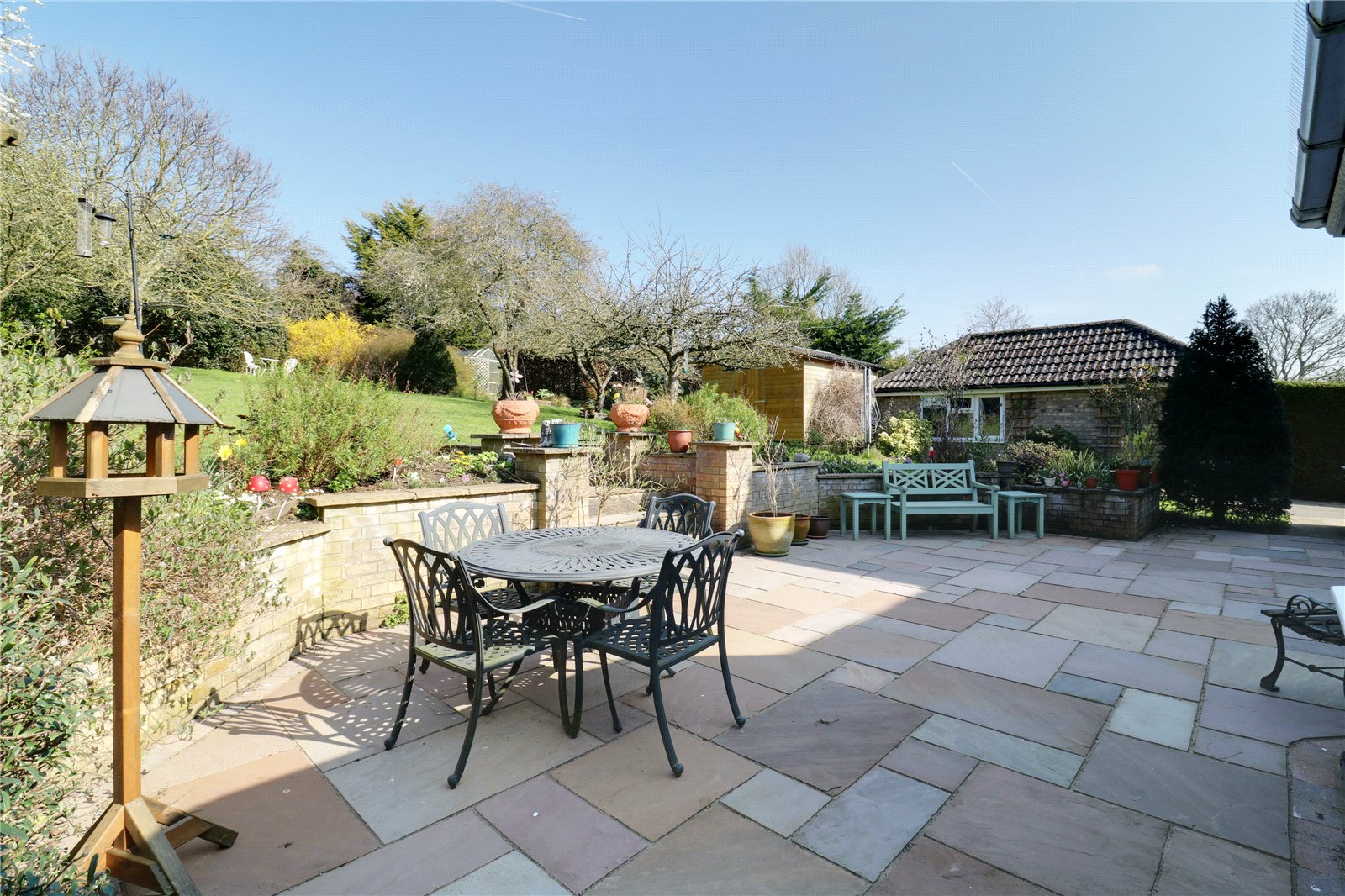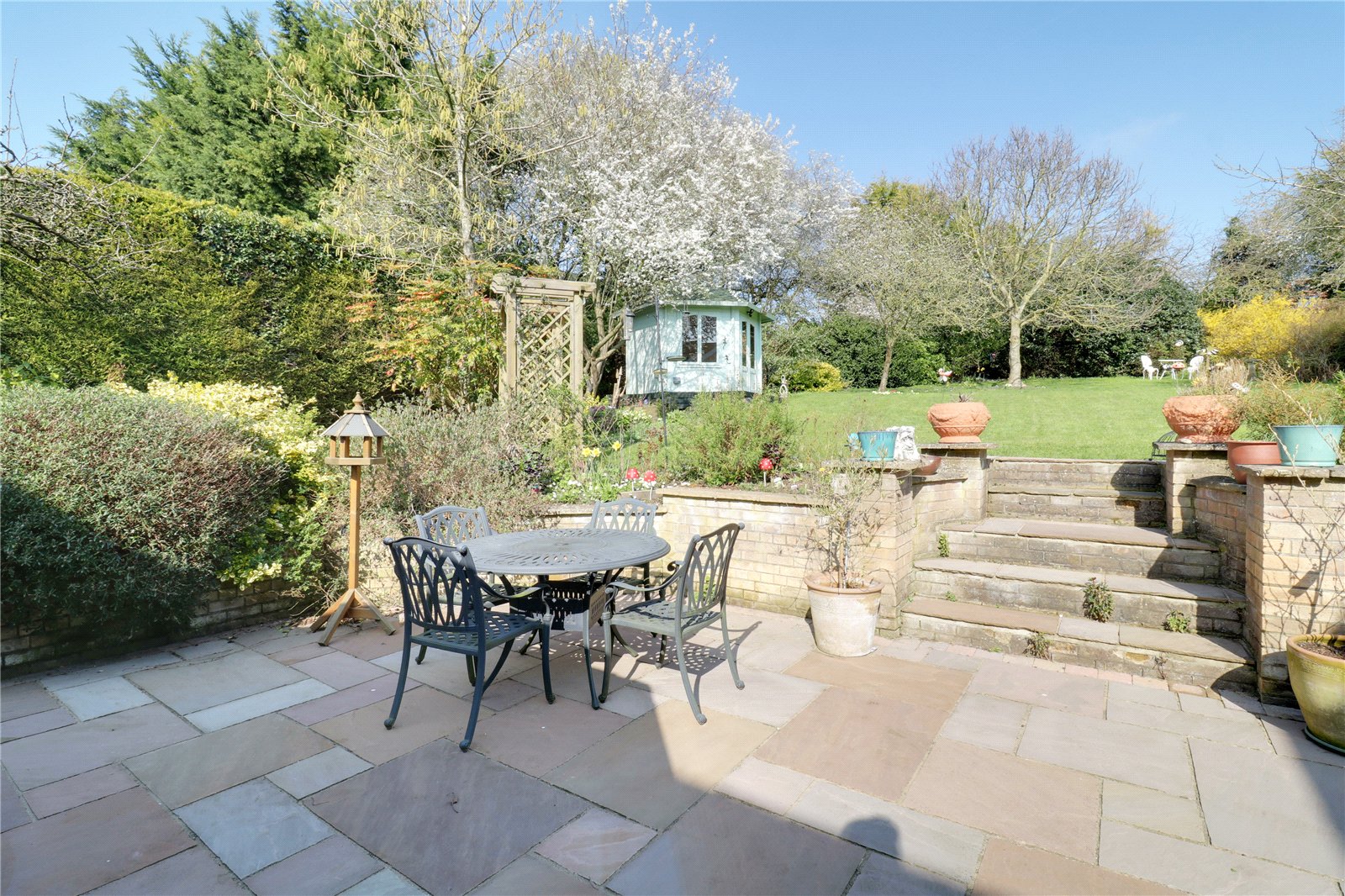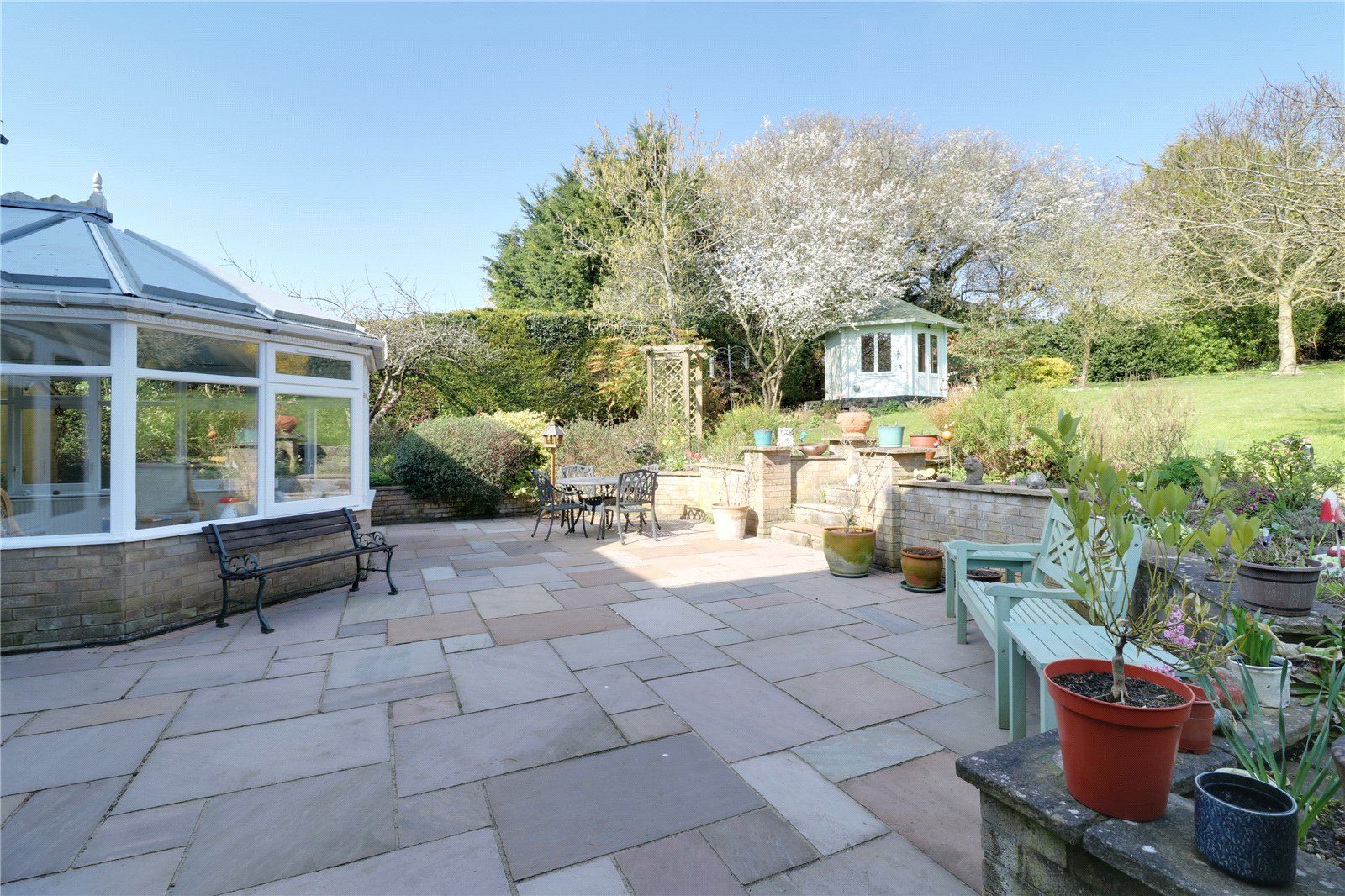 Externally, the property continues to impress. A substantial frontage provides ample off-road parking via a sweeping, hammer-head driveway, leading to secure gated access and a detached garage with automatic roller door. The rear gardens offer an excellent degree of privacy and have been thoughtfully designed for both relaxation and entertaining. A broad Indian sandstone terrace provides the perfect setting for outdoor dining, overlooking beautifully maintained lawns.