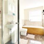 Rear uPVC double glazed window with patterned glazing providing a modern suite in white comprising a low flush WC, pedestal wash hand basin, tiled splash backs, panelled bath with tiled surround and separate walk-in shower cubicle with mains shower and glazed screen, tiled flooring and fitted chrome towel rail.