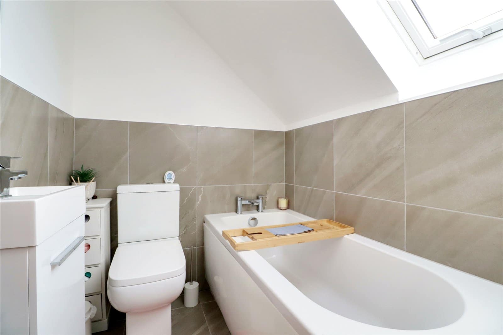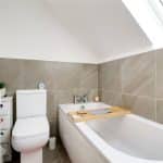 Rear double glazed Velux roof light provides a modern suite in white comprising a low flush WC, vanity wash hand basin, panelled bath, tiled flooring and part tiling to walls.