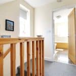 Side uPVC double glazed window with patterned glazing, open spell balustrading, wall mounted thermostat for the central heating and door with a separate landing area leads to the master bedroom.