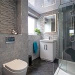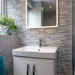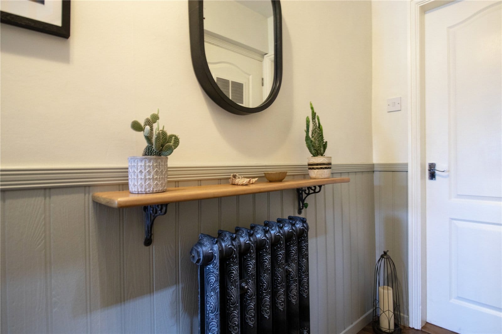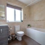 With front uPVC double glazed window, a three piece suite comprising a P-shaped panelled bath with overhead chrome mains shower, low flush WC, modern rectangular vanity wash hand basin with storage units beneath, fully tiled walls, cushion flooring, wall mounted towel heater, inset ceiling spotlights, loft access and extractor fan.