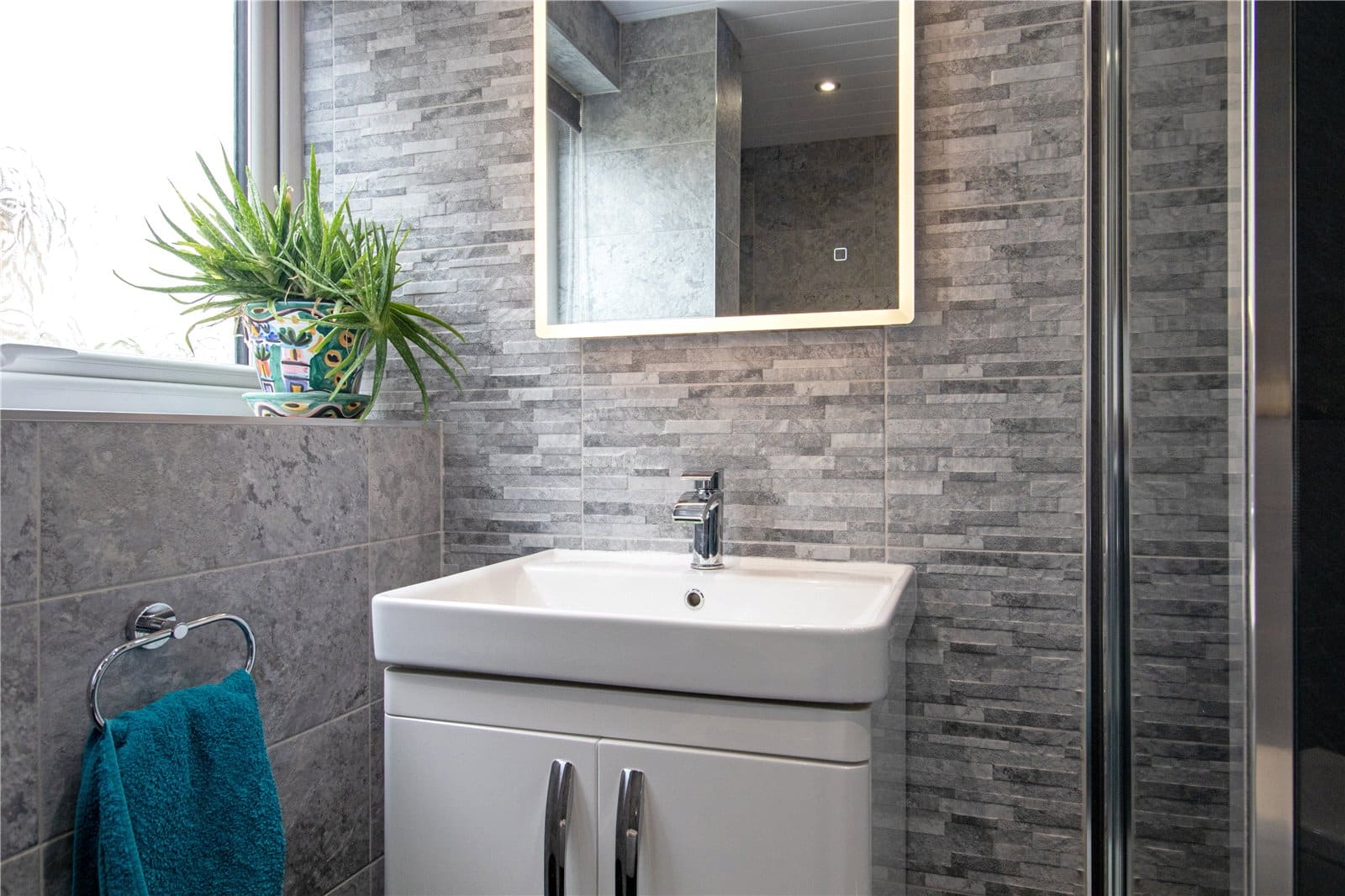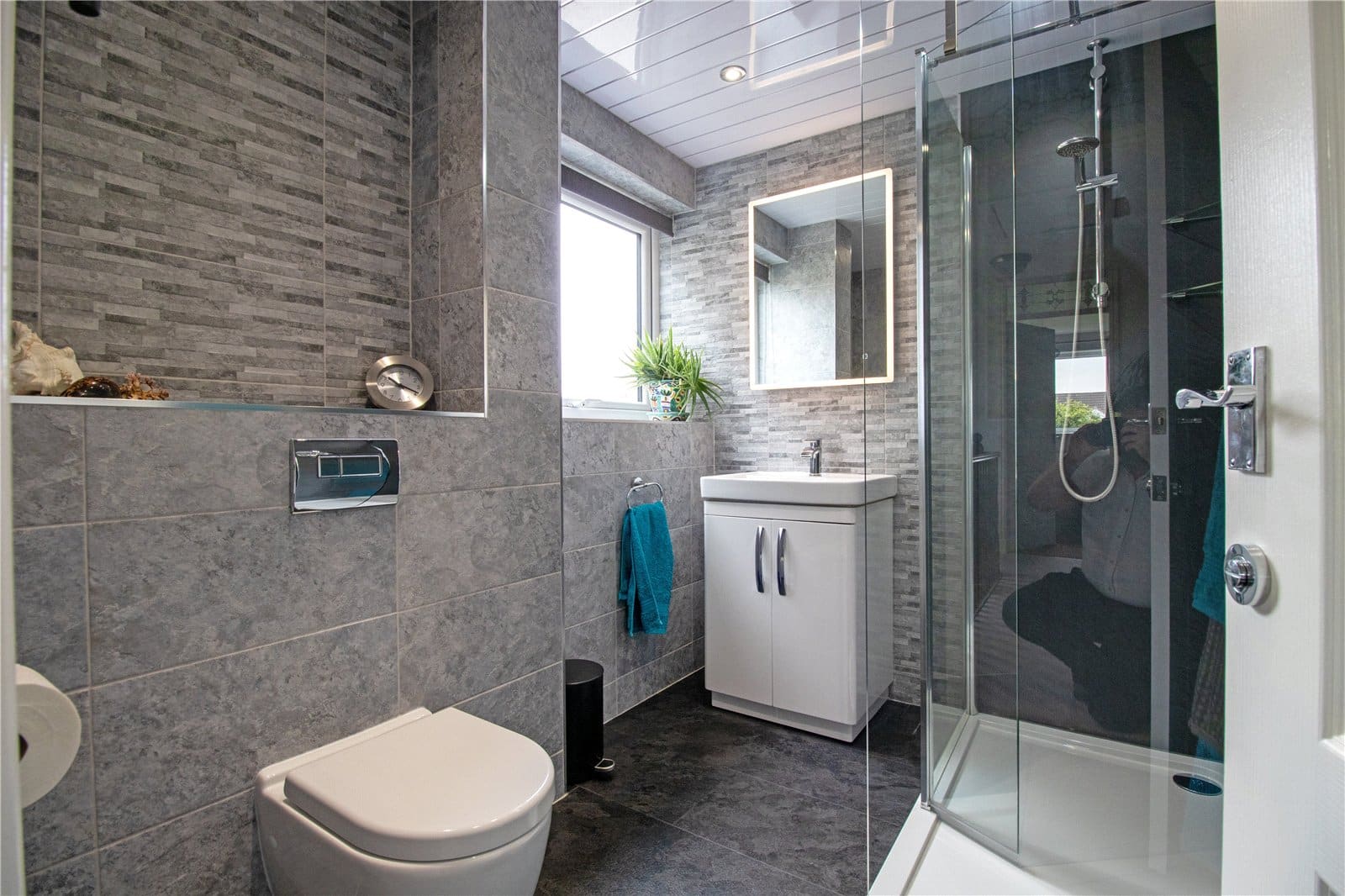 Includes a side uPVC double glazed window with frosted glazing and provides a three piece suite comprising double walk-in shower cubicle with overhead chrome mains shower and glazed screen, vanity wash hand basin with gloss twin storage units beneath with central block mixer tap, low flush WC, cushion flooring, fully tiled walls, panelling to the ceiling with inset ceiling spotlights, extractor fan and modern wall mounted towel heater in gun metal grey.