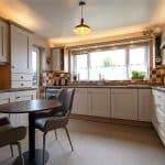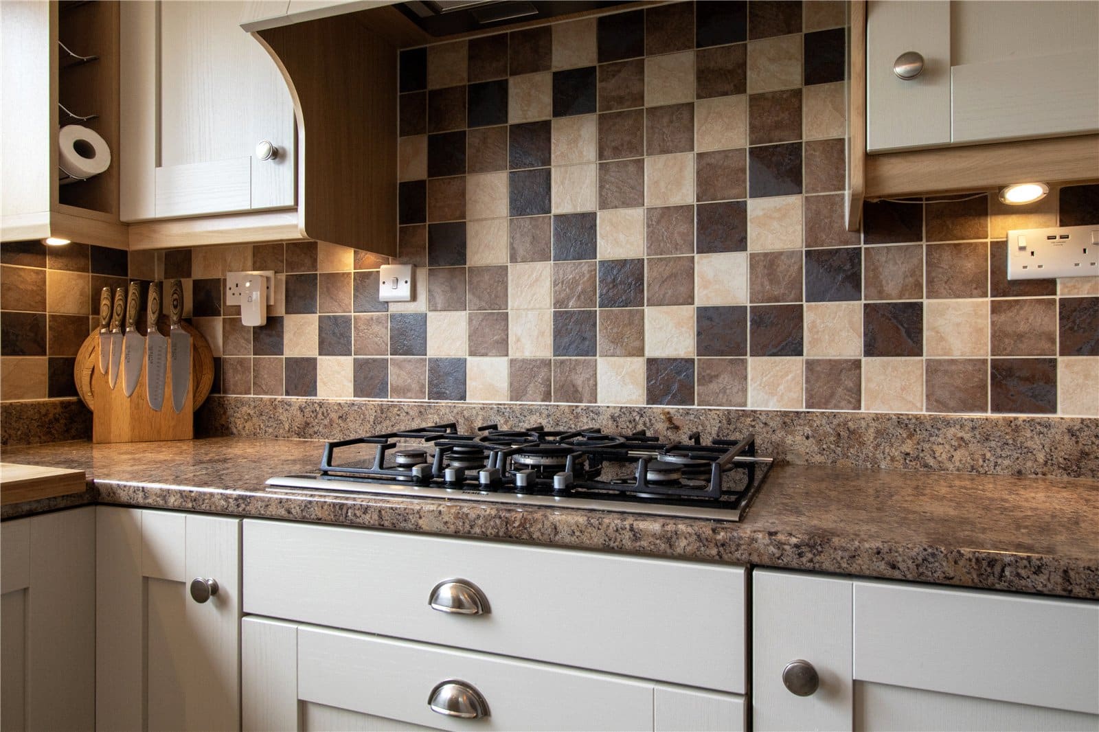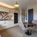 With a front uPVC double glazed window and a side uPVC double glazed door allowing access to the side of the property. The kitchen includes a range of light shaker style low level units, drawer units and wall units with brushed aluminum style pull handles and a patterned working top surface with matching uprising and tiled splash back with matching tiled window sill incorporating a one and a half bowl ceramic sink unit with block mixer tap and drainer to the side, a range of integral high end Siemen appliances with a five ring gas hob with overhead canopied extractor fan, matching oven, grill and microwave, plumbing for a washing machine and dishwasher, integral fridge and matching freezer, inset ceiling spotlights, inset high level modern lighting and also downlighting to the high level units, cushion flooring and modern vertical wall mounted radiator in black.
