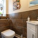 With side uPVC double glazed window with frosted glazing and a two piece modern suite comprising low flush WC and a vanity corner wash hand basin with gloss storage unit beneath, part tiled walls and cushion flooring.