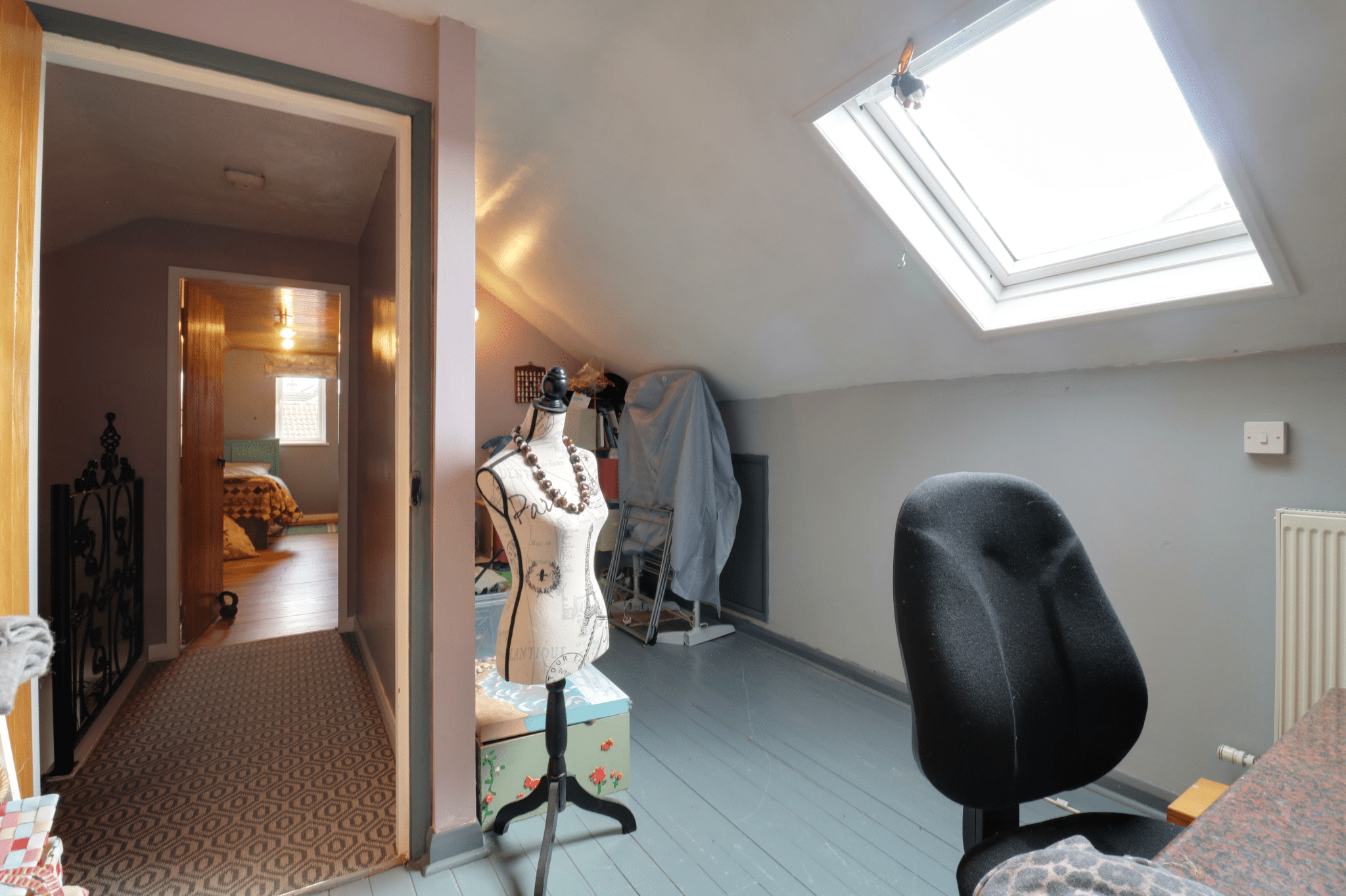To the first floor, a central landing with built-in storage gives access to two versatile bedrooms, both benefitting from useful eaves storage.