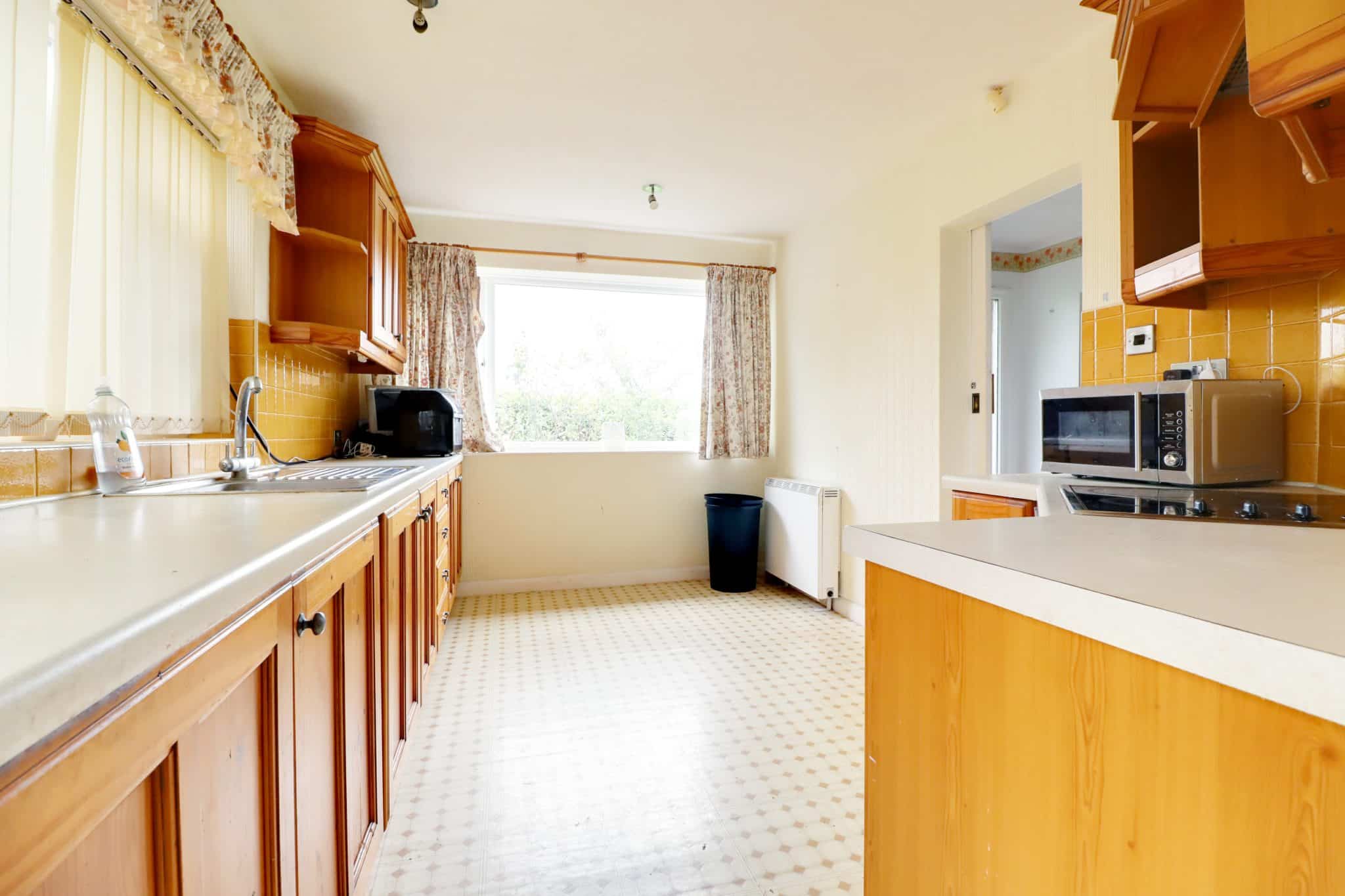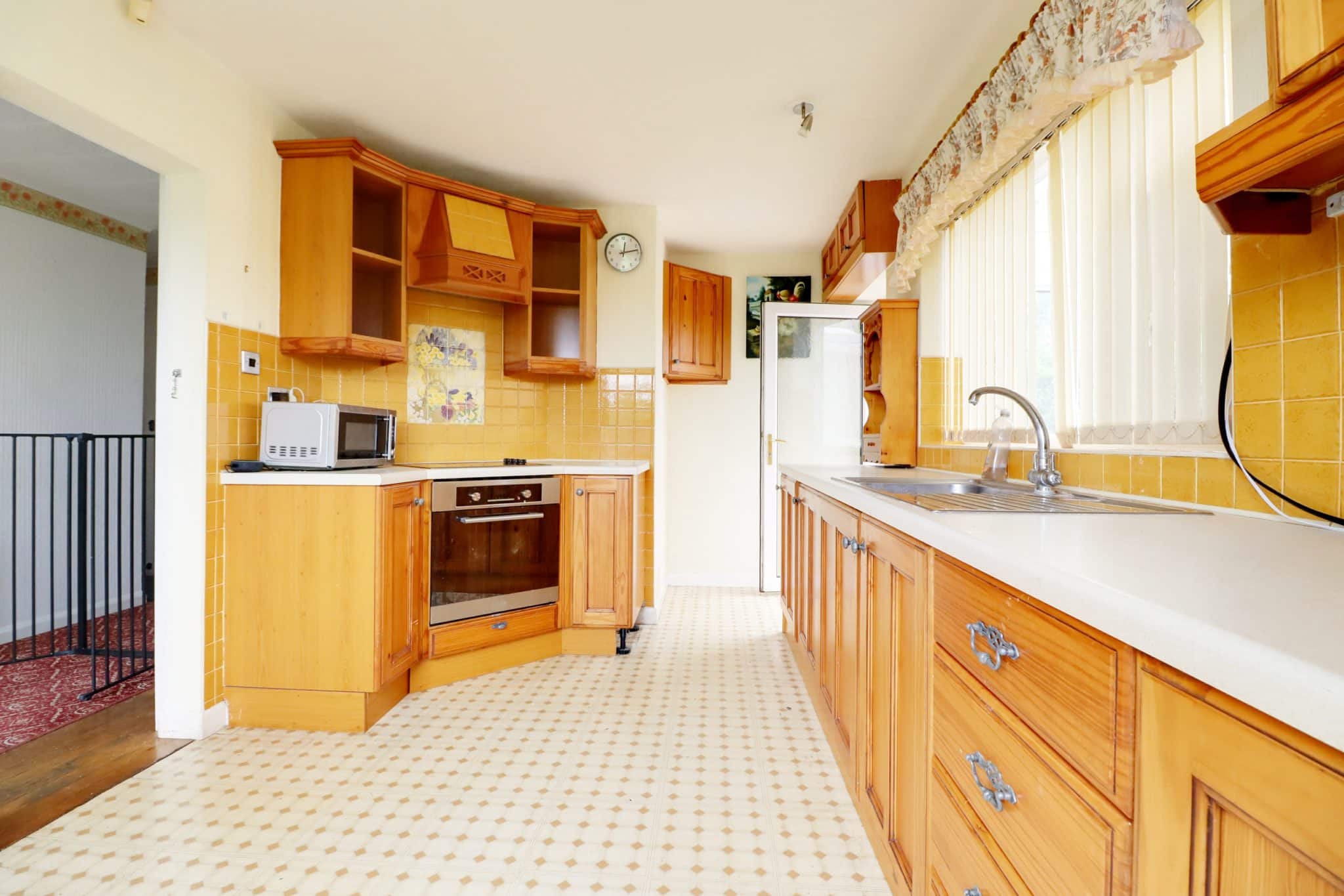 With a front uPVC double glazed window and matching side entrance door, internal single glazed window looking through to the utility. The kitchen enjoys a range of pine fitted furniture with a rolled edge worktop and tiled splash backs that incorporates a stainless steel sink unit with drainer to the side and block mixer tap, built in 4-ring electric hob with oven beneath and overhead extractor.