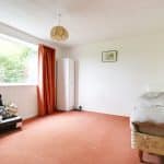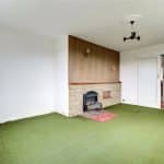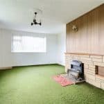 Enjoying a dual aspect with front and side uPVC double glazed windows, electric storage heater and stone faced fireplace with wooden paneling above.