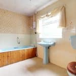 With a side uPVC double glazed window with pattern glazing and a three piece coloured suite comprising of a low flush WC, pedestal wash hand basin, paneled bath with shower above, paneling and tiling to walls and electric storage heater.