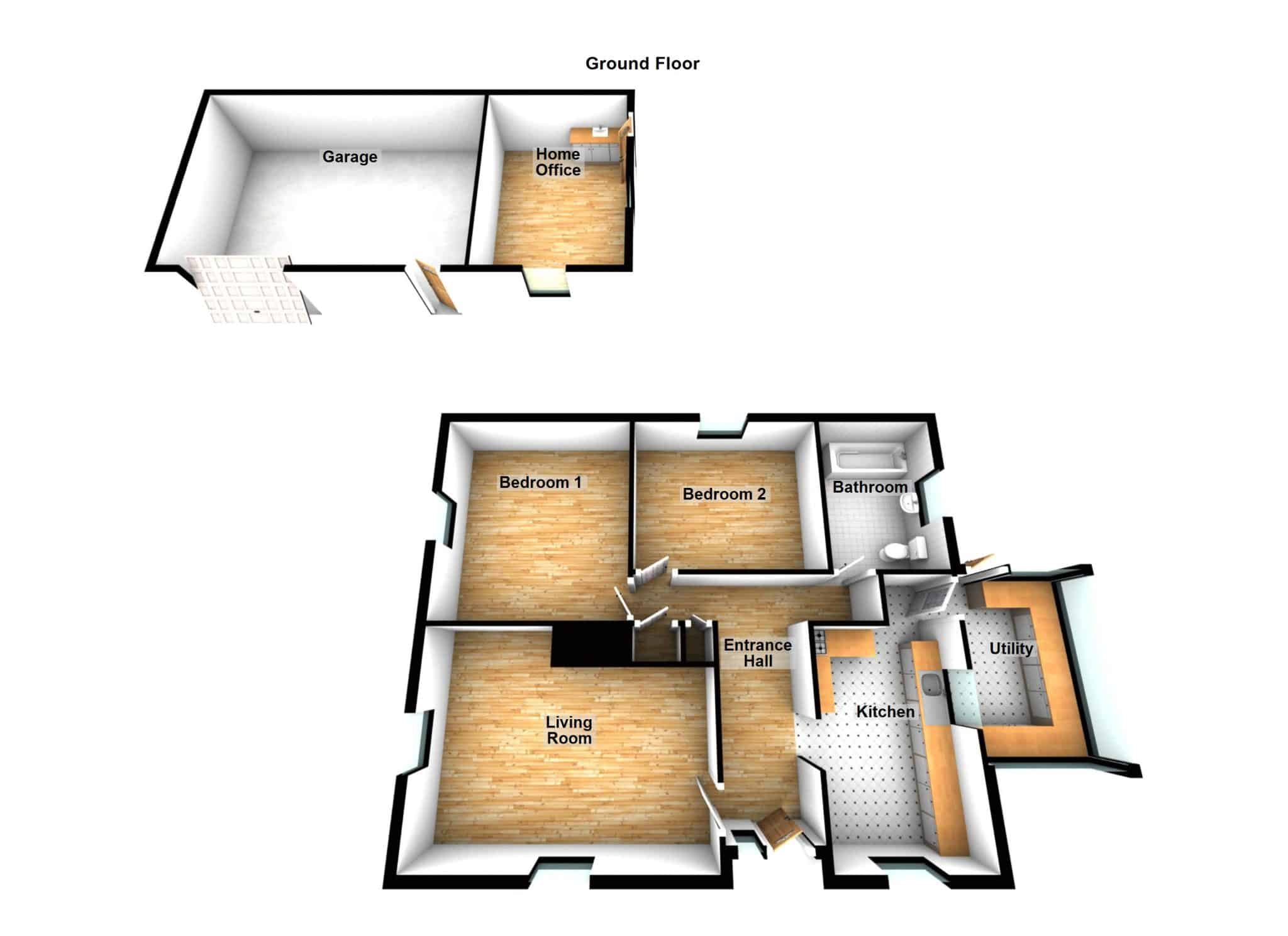 Within the footprint there is a home office with uPVC double glazed entrance door, front and side uPVC windows, being fully plastered and decorated with a fitted sink unit with storage beneath and tiled splash back.