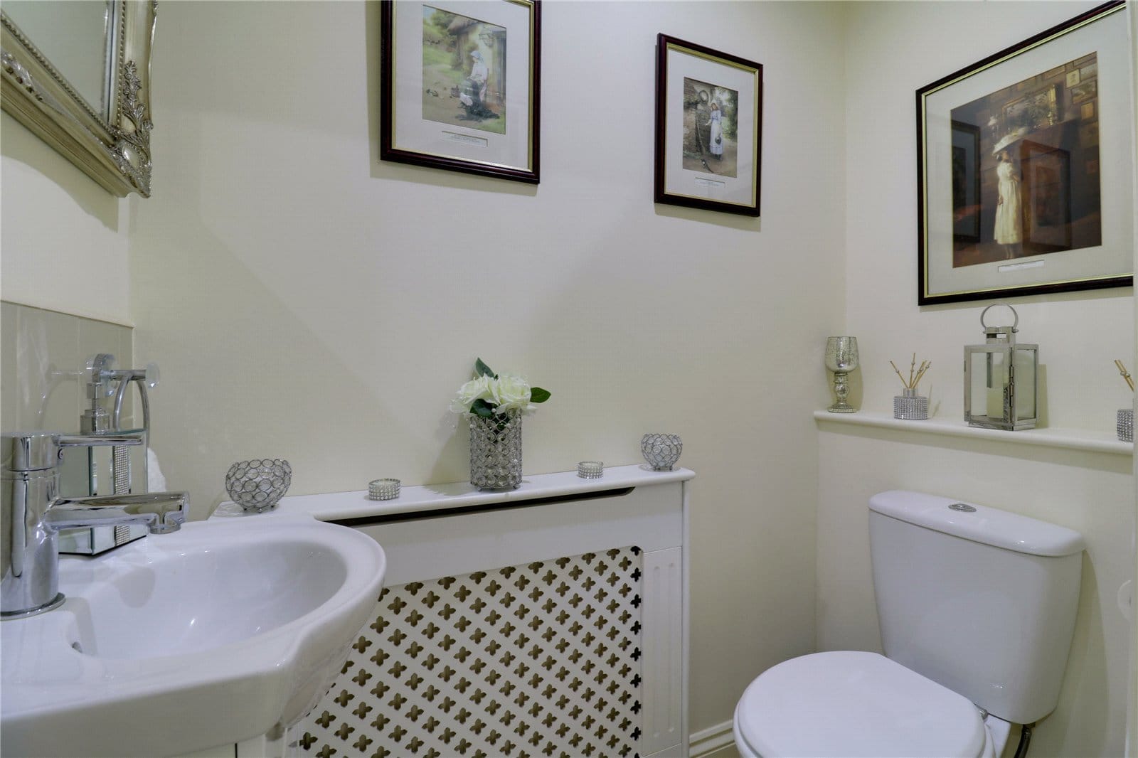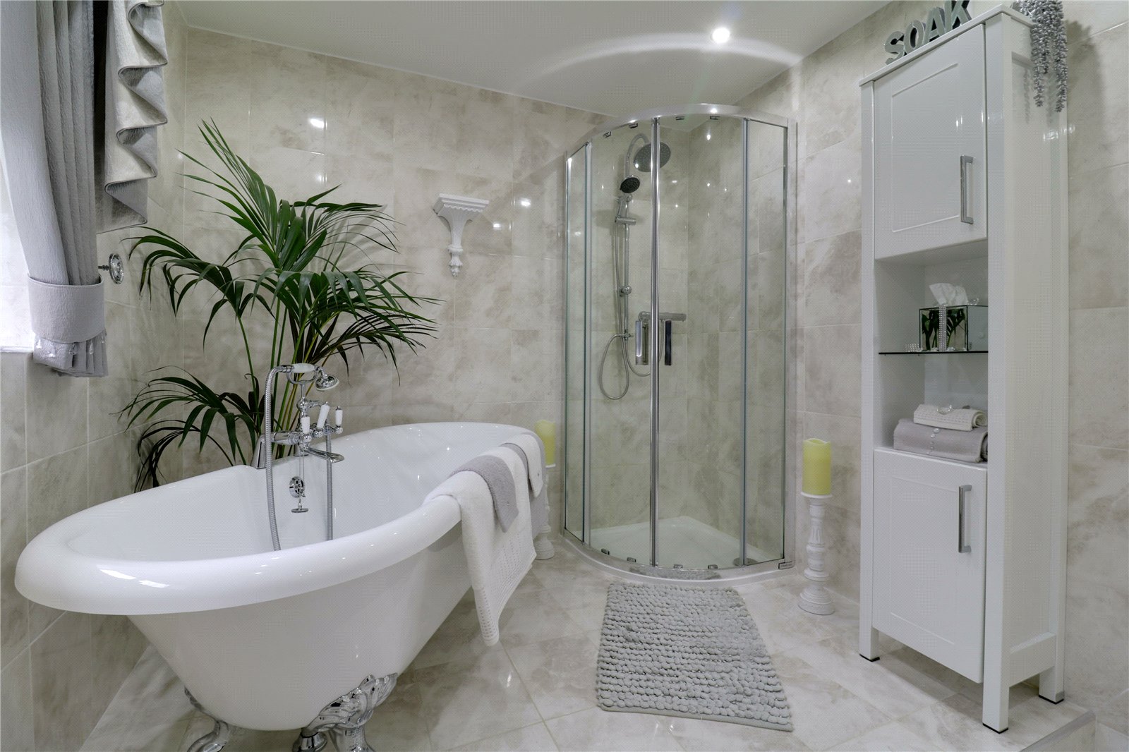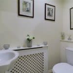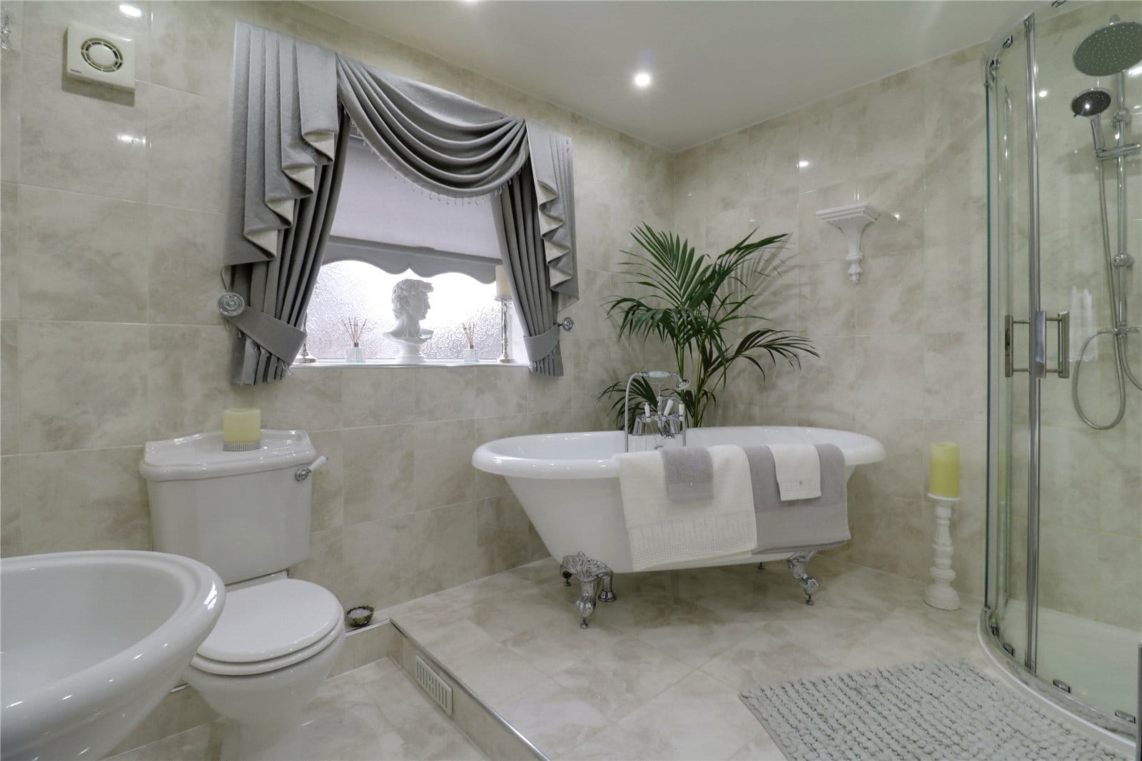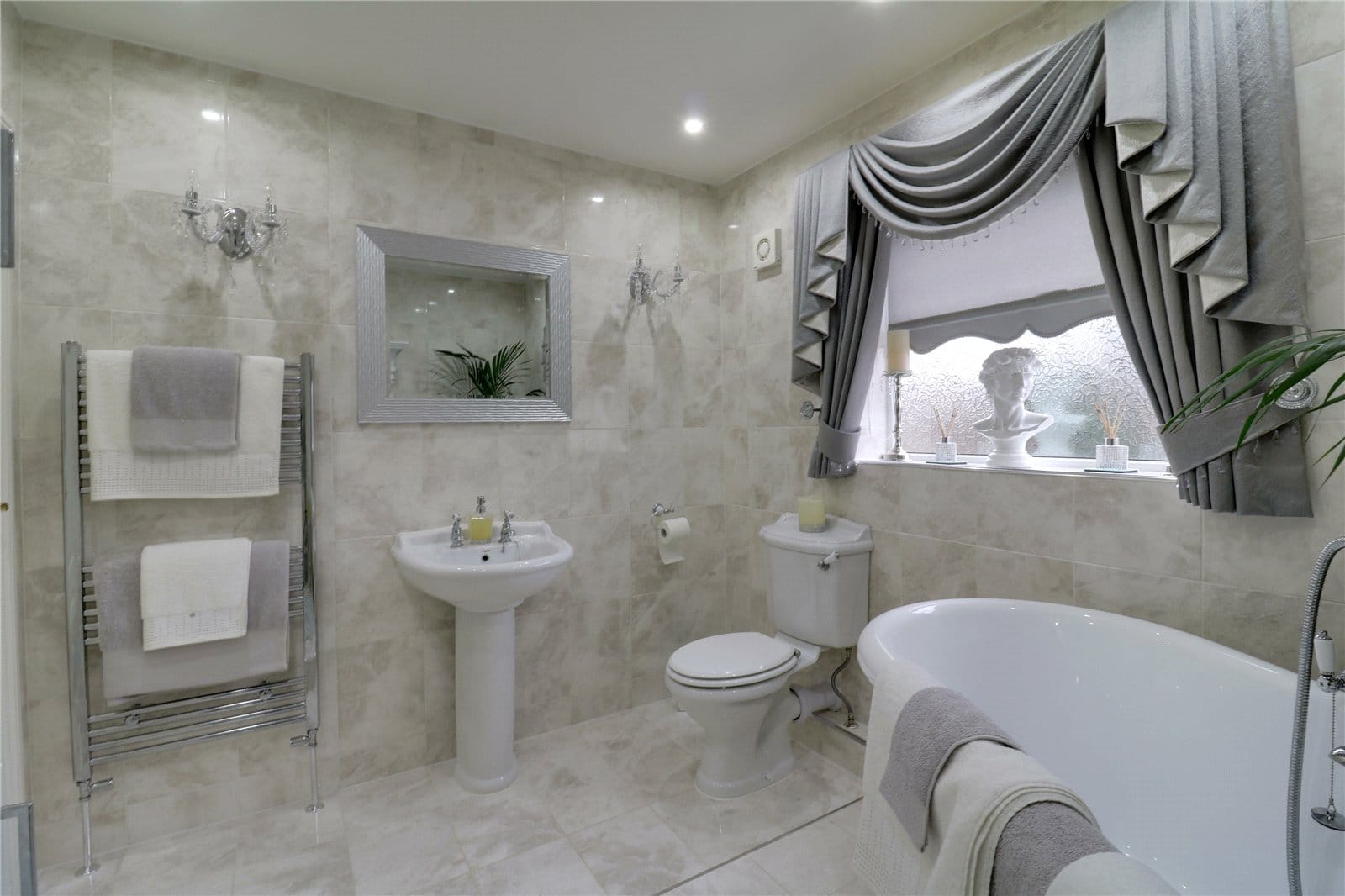 With a rear uPVC double glazed window with frosted glazing providing a four piece suite comprising of a corner walk-in shower cubicle with overhead chrome mains shower with twin curved glazed doors, a free standing rolled edged top bath with central block mixer tap and shower attachment, a low flush WC and pedestal wash hand basin, a wall mounted chrome towel heater, two double wall lights, modern inset ceiling spotlights, extractor fan and attractive tiled and matching tiling to the walls.