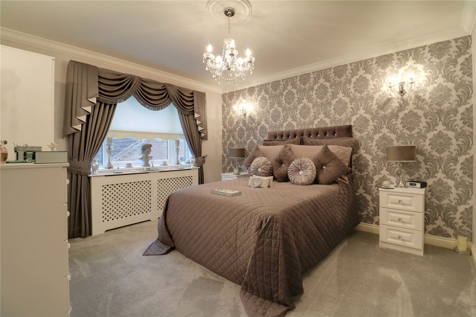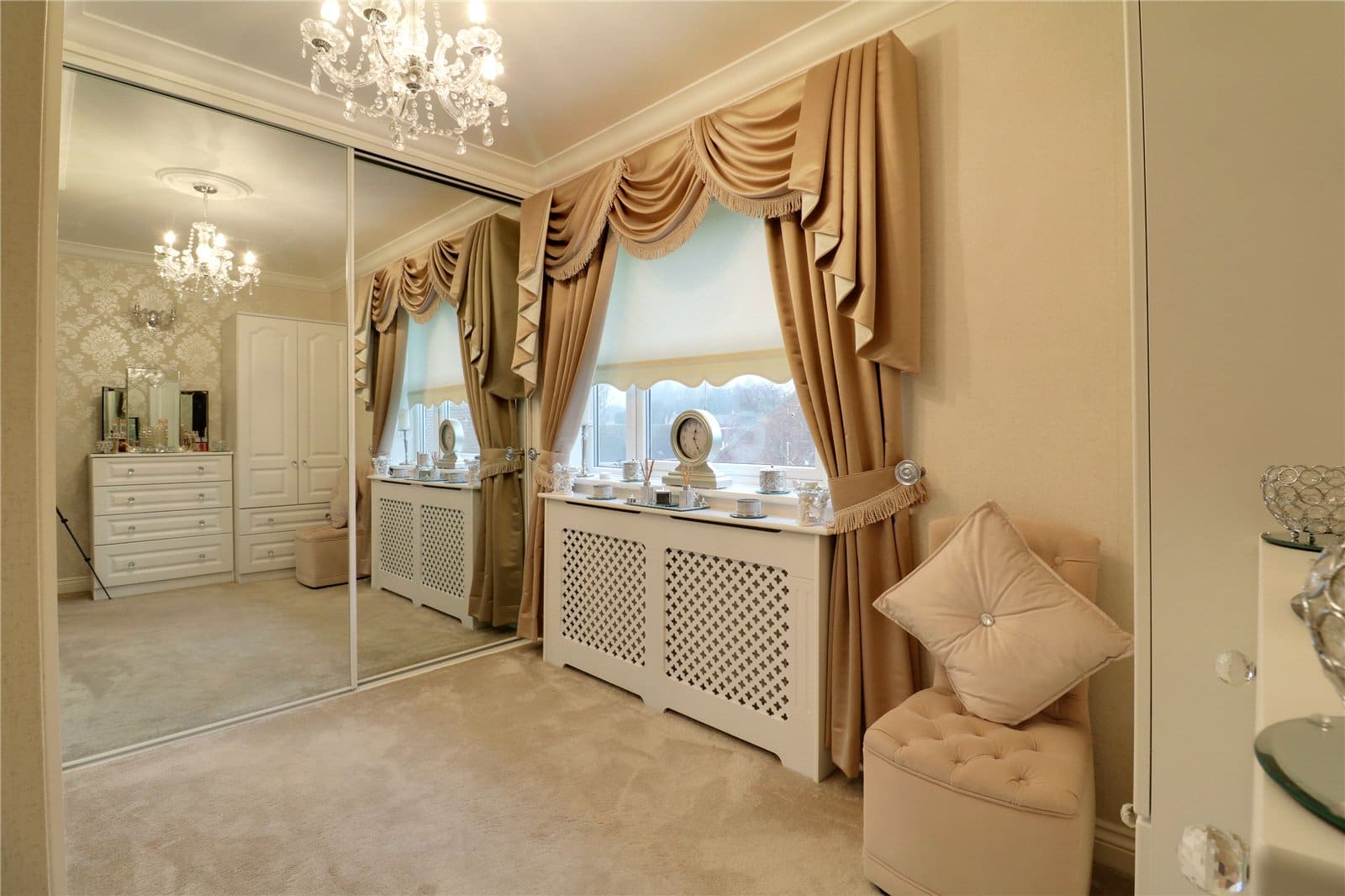 With a front uPVC double glazed window, TV input, wall to ceiling coving, two double wall lights, a bank of fitted wardrobes with sliding mirrored doors and an internal door allows access off to;