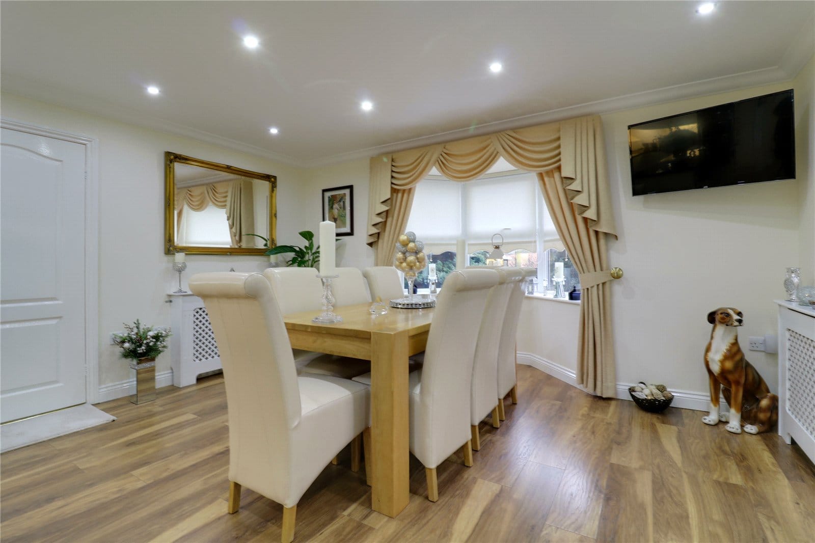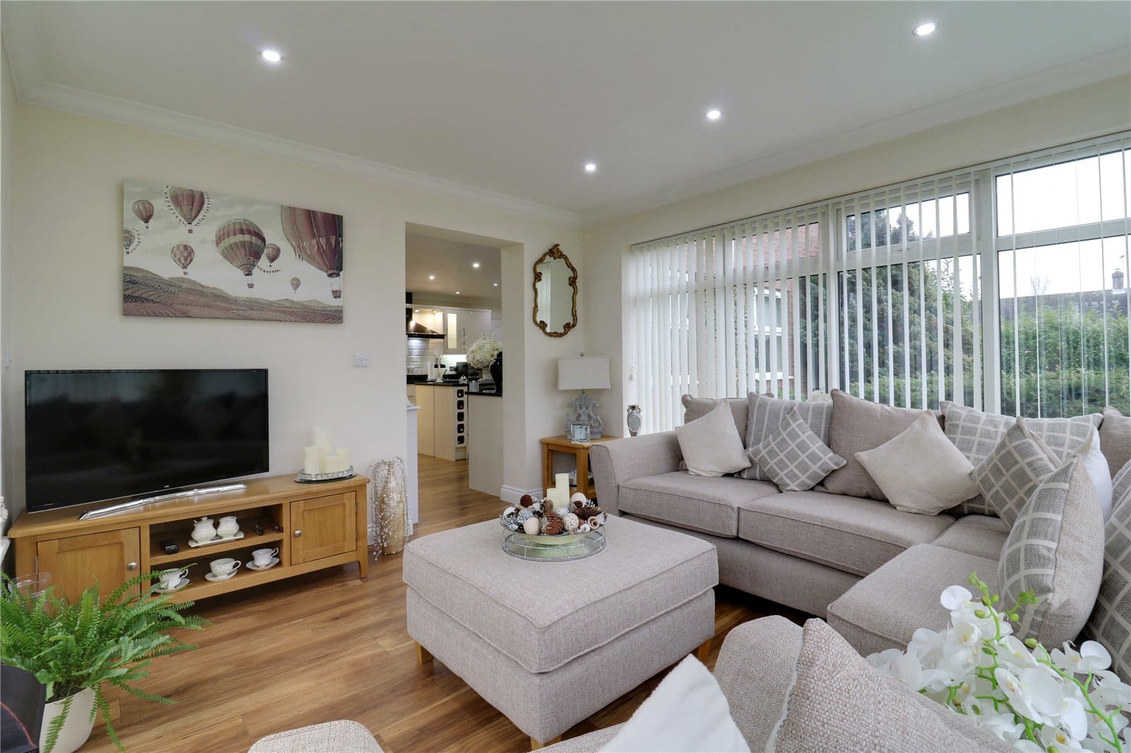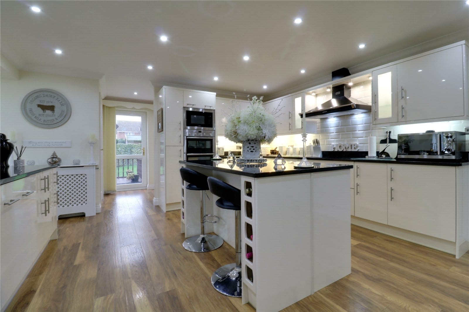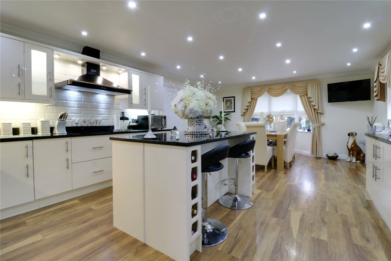 Dimensions: 4.5m x 6.83m. Enjoying a multi aspect with a front bay uPVC double glazed window and two side uPVC double glazed windows. The kitchen includes a range of cream gloss fronted low level units drawer units and wall units with brushed aluminium style pull handles and quality quartz working top surfaces with matching uprising incorporating a one and a half inset stainless steel sink unit with drainer to the side and block mixer tap, a range of integral Neff appliances which includes a double oven with grill and microwave above, a four ring induction hob with overhead Stoves canopied extractor fan with downlighting, ceramic tiled splash backs, integral dishwasher, a central matching breakfast bar island with inset wine shelving and matching drawers and low level units, attractive laminate style flooring, inset ceiling spotlights and an opening leads through to;